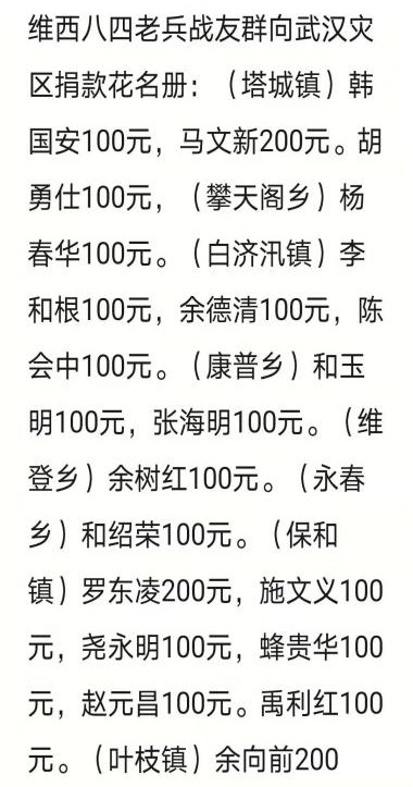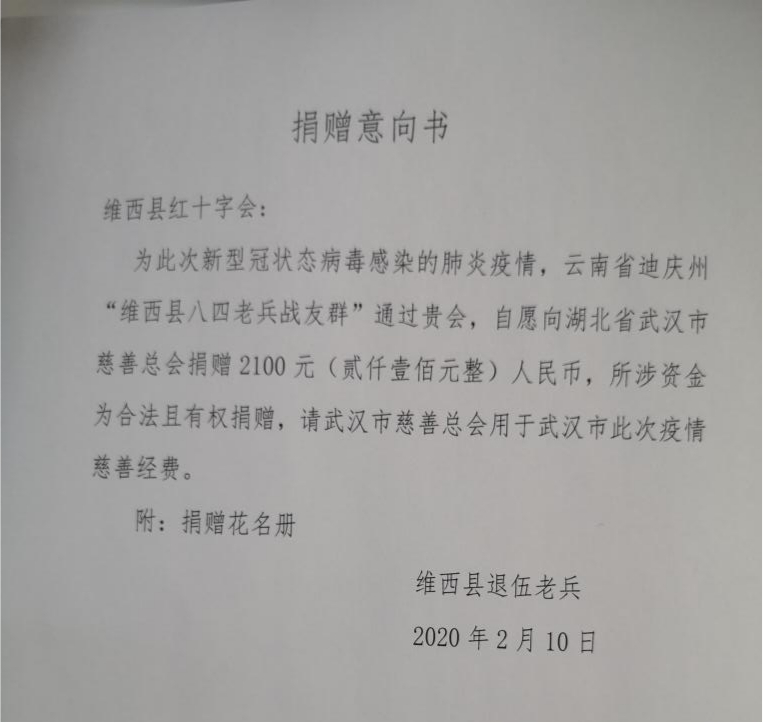 2月10日,维西县退役军人赵元昌、罗东凌、施文义等18名83年入伍的退伍军人自发向武汉捐款,为抗击疫情贡献一份力量,表达退役军人对抗击疫情的关心支持。