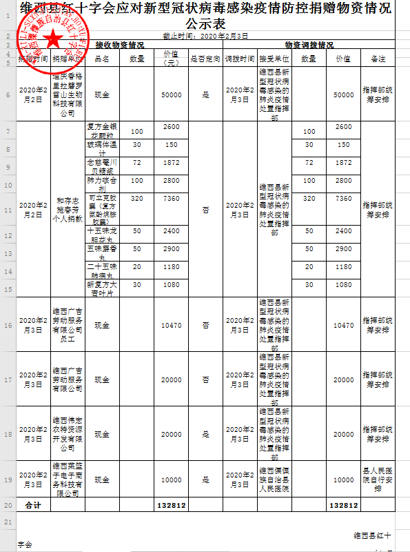 维西县红十字会应对新型冠状病毒感染疫情防控捐赠物资情况公示