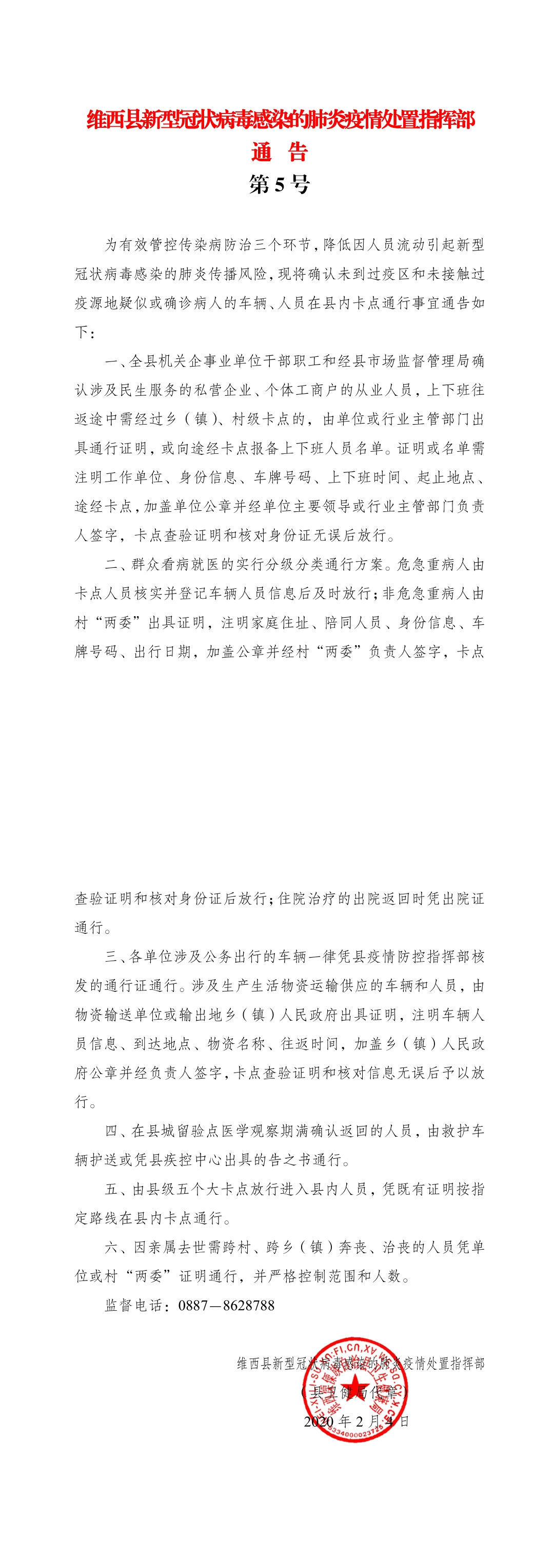 维西5号通告:关于确认未到过疫区和未接触过疫源地疑似或确诊病人的车辆、人员在县内卡点通行事宜