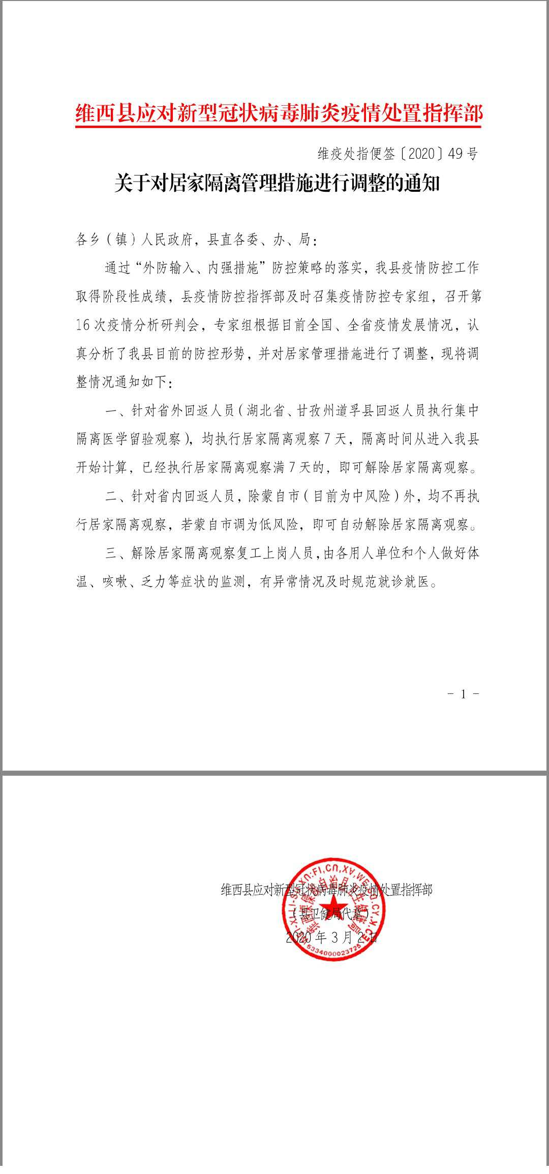 维西县疫情指挥部关于居家隔离管理措施进行调整的通知