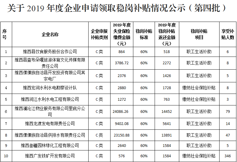 根据《关于失业保险支持企业稳定岗位有关问题的通知》(云人社发〔2015〕16号)、《人力资源社会保障部 财政部关于使用失业保险支持脱贫攻坚的通知》(人社部发〔2018〕35号)《人力资源社会保障厅 云南省财政厅关于进一步发挥失业保险稳定岗位促进就业作用有关问题的通知》(云人社发〔2018〕38号)及《云南省人力资源社会保障厅办公室关于改进失业保险稳岗返还服务的通知》(云人社办通〔2020〕5号)等相关文件精神,现对我县8家企业申领2019年度失业保险稳岗补贴进行公示,公示期为2020年3月11日至3月17日。如对公示信息有异议,请在公示期内实名向维西县人力资源和社会保障局反映,逾期不予受理。