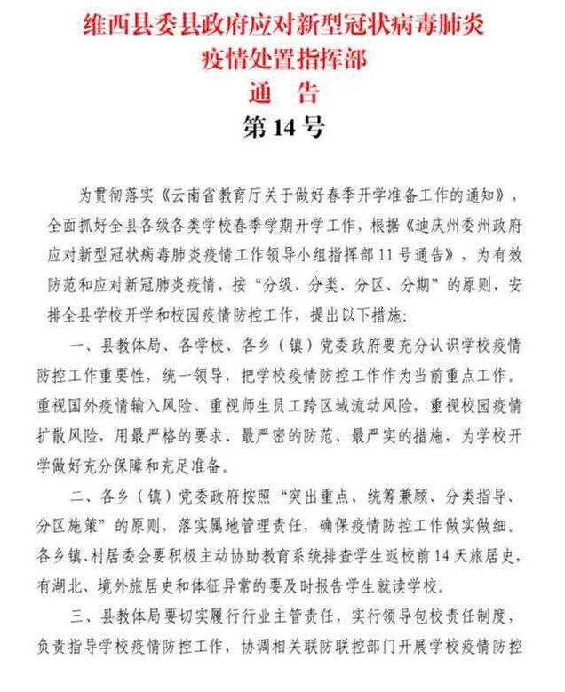 维西县委县政府应对新型冠状病毒肺炎疫情处置指挥部通告 第14号