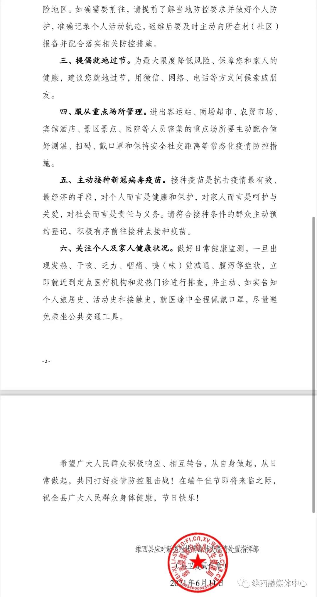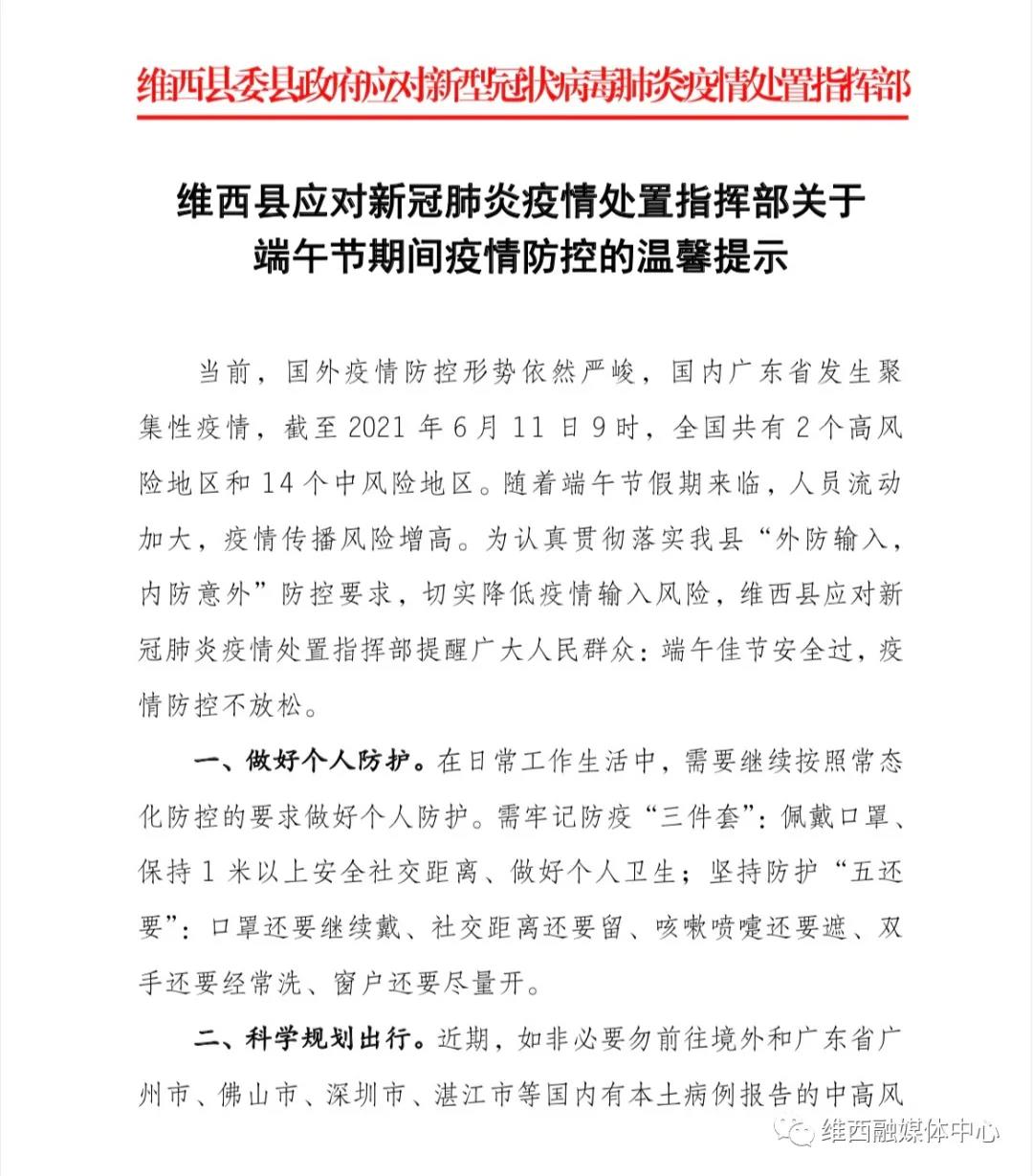 维西县应对新冠肺炎疫情处置指挥部关于端午节期间疫情防控的温馨提示