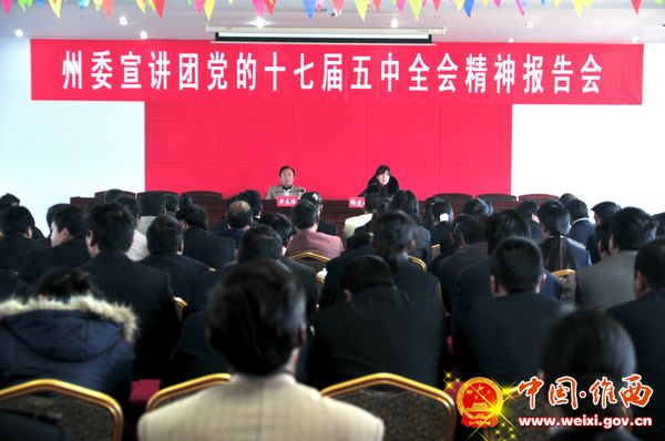 为使全县各级党组织和广大党员以高度的政治责任感和使命感,加强领导,精心组织,迅速在全县掀起学习宣传贯彻十七届五中全会精神的热潮,把思想统一到全会精神上来,把力量凝聚到全会确定的各项任务上来,推动全县经济社会又好又快发展。12月28日,州委宣讲团党的十七届五中全会精神报告会在维西亚太酒店五楼隆重举行。州委党校组织科科长、副教授杨爱清为县直各部门、省属驻县各单位副科级以上领导干部近300人作十七届五中全会精神专题辅导报告。报告会由维西县委副书记余春桥主持。
