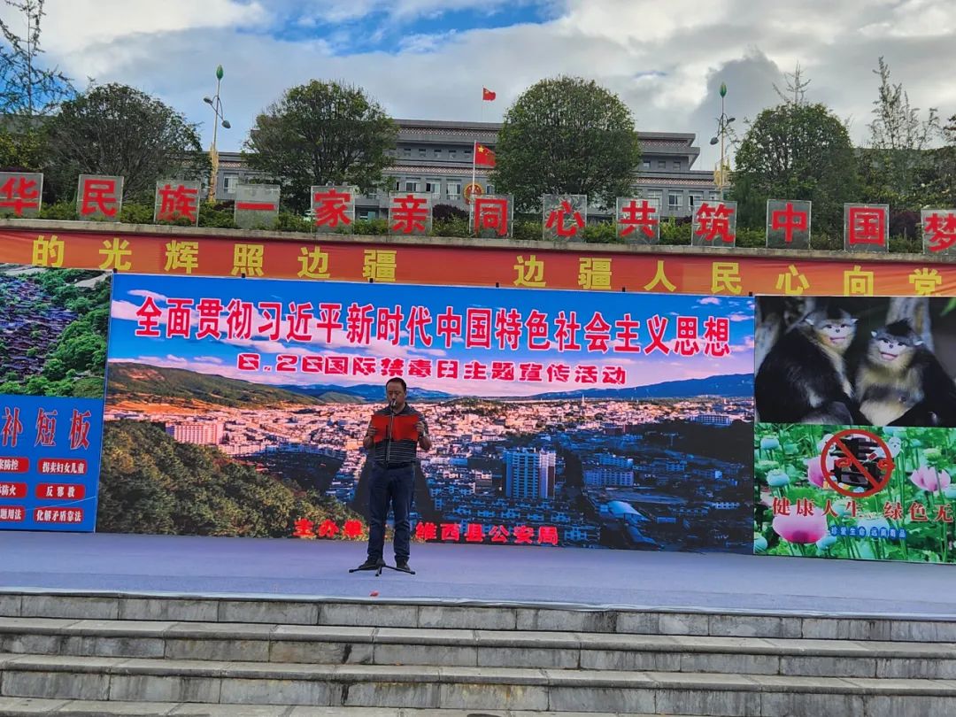 活动以维西县传统民族节目、非遗文化《阿尺木刮》开场,吸引广大人民群众眼球,同时在户外电子投屏滚动播放“绿色人生 健康无毒”为主题的禁毒公益宣传片,营造了浓厚宣传氛围。公安民警、禁毒志愿者将集合我县禁毒、命案防控、电信网络诈骗、森林防火等知识的宣传册发放到参加活动的学生、公职人员、行业代表及人民群众手中,并对禁毒宣传展板、毒品仿真模型进行详细介绍,主持人结合主题宣传内容组织开展禁毒知识竞答环节,群众积极参与,反响热烈。最后,一首歌颂禁毒公安民警的歌曲《一路向前》掀起活动高潮。