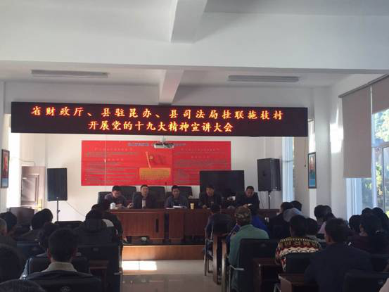 为宣传贯彻党的十九大精神,让党的十九大精神真正深入基层、深入群众、深入人心,拖枝村召开由省财政厅、县驻昆办、县司法局联合开展的党的十九大精神宣讲大会