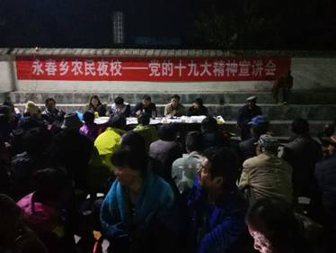 在党的十九大胜利召开后,永春乡结合村民小组分布情况,依托村民小组活动场所阵地,按照方便群众、服务群众学习十九大精神的原则,及时成立“农民夜校”。各村党总支书记为“农民夜校”校长,第一书记为“农民夜校”副校长,乡党委班子成员为宣讲团成员。通过开办“农民夜校”,深入开展“拥护核心、心向北京”和“不忘初心、牢记使命”主题教育,集中宣讲党的十九大精神,宣传法律法规、脱贫政策、安全生产、森林防火等知识,培养脱贫攻坚明白人,勤劳致富自强人,进一步激发广大农民群众特别是贫困群众自力更生、艰苦奋斗,改变贫穷落后面貌,创造幸福美好生活的内生动力。