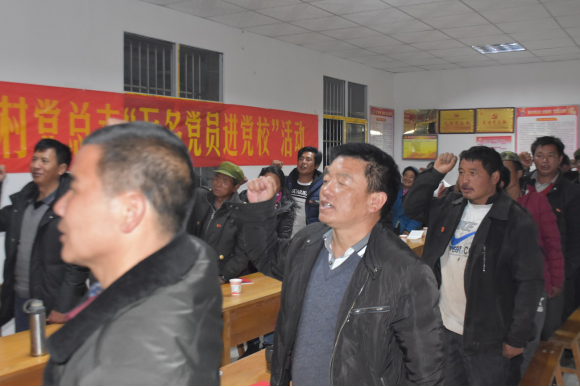 3月28日19时,县人大常委会机关党支部与腊八底村党总支第三支部在腊八底村第三支部党员活动室举行了“万名党员进党校”培训班开班仪式。两支部党员佩戴党员徽章,面向党旗,重温入党誓词,高唱中华人民共和国国歌。