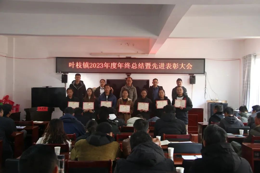 会议还表彰了在2023年度各项工作中表现突出、做出贡献的4个先进集体和9名先进个人,营造了浓厚的比学赶超氛围,让广大叶枝镇干部职工学有标杆、敢有方向、做有榜样。