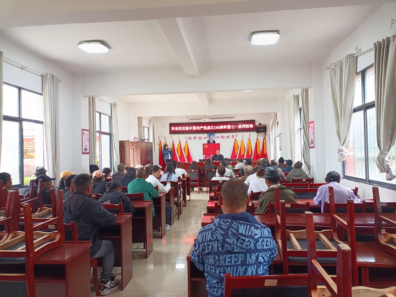 为庆祝中国共产党成立104周年,齐乐村于7月4日开展了庆“七一”主题活动。迪庆州政府研究室党组书记、主任及党组成员,村“两委”、驻村工作队、村各支部全体党员、群众共计100余人参加了活动。