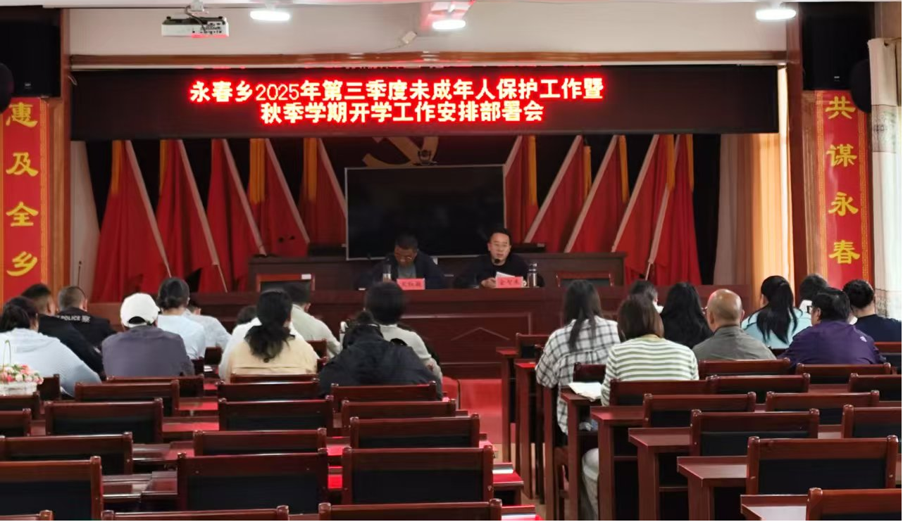 为贯彻落实上级关于未成年人保护工作的决策部署,确保秋季学期学校工作平稳有序开展,2025年9月10日,永春乡召开2025年第三季度未成年人保护工作暨秋季学期开学工作安排部署会。乡党政班子成员、五办四中心负责人、各村党总支书记、驻村工作队长,派出所、中心校、卫生院相关负责人参加会议。