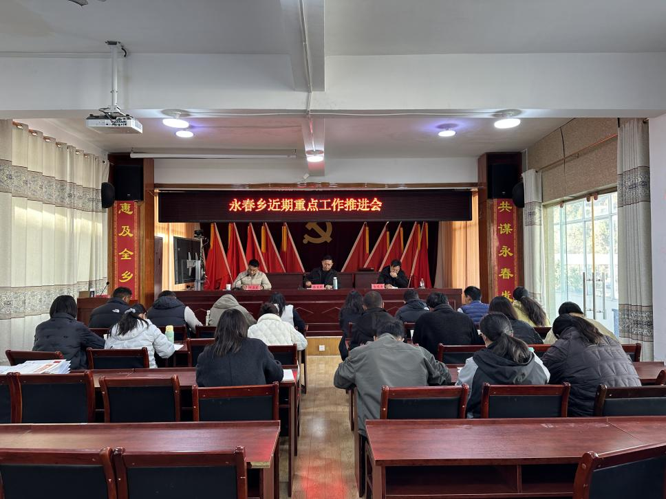 11月19日上午,永春乡召开近期重点工作推进会议,旨在对当前重点工作进行再安排、再部署,切实压实工作责任,确保落实好近期各项工作。乡党政班子成员,各办(中心)负责人,各村“两委”负责人、永春卫生院主要负责人参加会议。