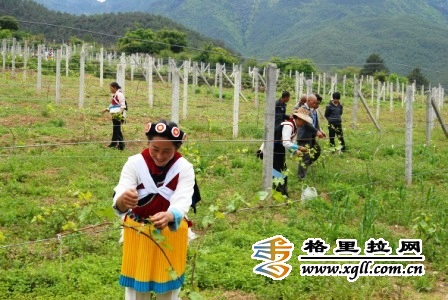 图为启别村群众抓住节令在冰葡萄基地锄草修枝。去年,维西县塔城镇启别村实施整村推进项目,投入250万元建设了470亩冰葡萄基地。村党总支部带领成立了冰葡萄产业建设理事会,按照“统一管理,利益共享”的模式运作。经过一年的建设,74户农户种植了冰葡萄,预计今年葡萄产值将达32万元。(钱兴摄影报道)