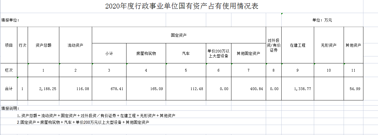 截至2020年12月31日,云南省迪庆州维西县公安局交通警察大队部门资产总额2188.24万元,其中,流动资产116.08万元,固定资产678.41万元,对外投资及有价证券0万元,在建工程1338.77万元,无形资产0万元,其他资产54.99万元(具体内容详见附表)。与上年相比,本年资产总额增加本年资产总额减少0.14万元,其中固定资产减少0.12万元。处置房屋建筑物0平方米,账面原值0万元;处置车辆3辆,账面原值37.08万元;报废报损资产134件,价值为96.68万元。实现资产处置收入0万元;出租房屋0平方米,账面原值0万元,实现资产使用收入0万元。