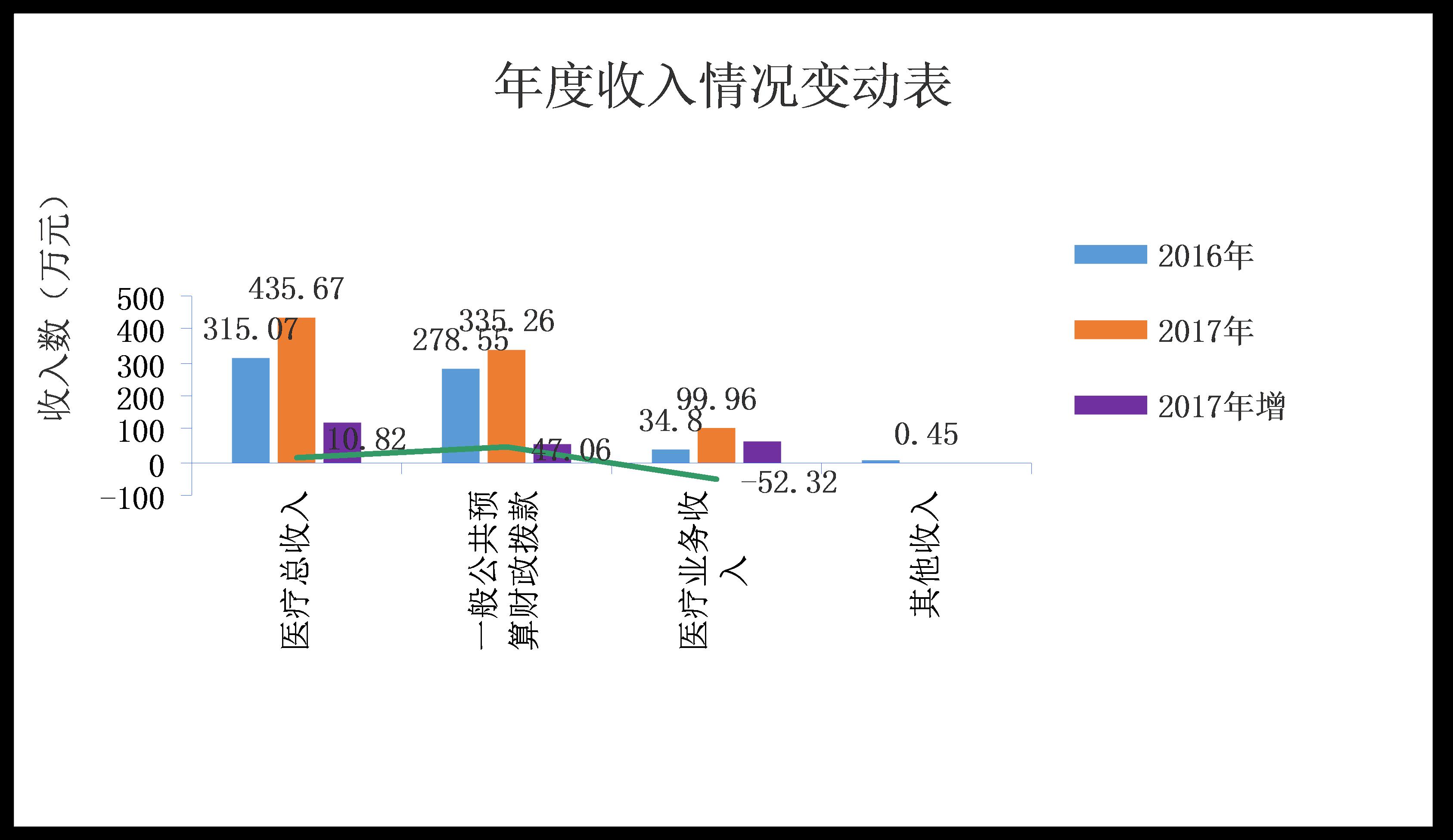 2017年我院医疗总收入435.67万元,其中一般公共预算财政拨款收入335.26万元,医疗业务收入99.96万元,其他收入0.45万元;
