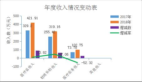 2018年我院医疗总收入4219094.71元,其中一般公共预算财政拨款收入3191625.91元,医疗业务收入1027468.8元;医疗总支出4001527.76元,其中人员经费支出3969279.68元,日常公用经费32248.08元。因2018年12月调资,2018年9月新进2名人员,故一般公共预算财政拨款收入与上年度相比增加;2018年节省日常公用经费,与上年度相比有所减少;2018年因住院病人增加,故医疗业务收入与上年度相比有所增加。