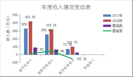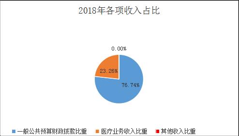 2018年总收入657.36万元。其中一般公共预算财政拨款504.48万元;医疗业务收入152.88万元;其他收入0万元。与2017相比变动情况: