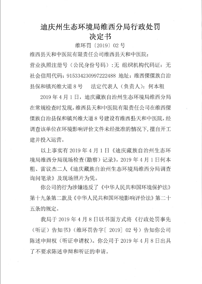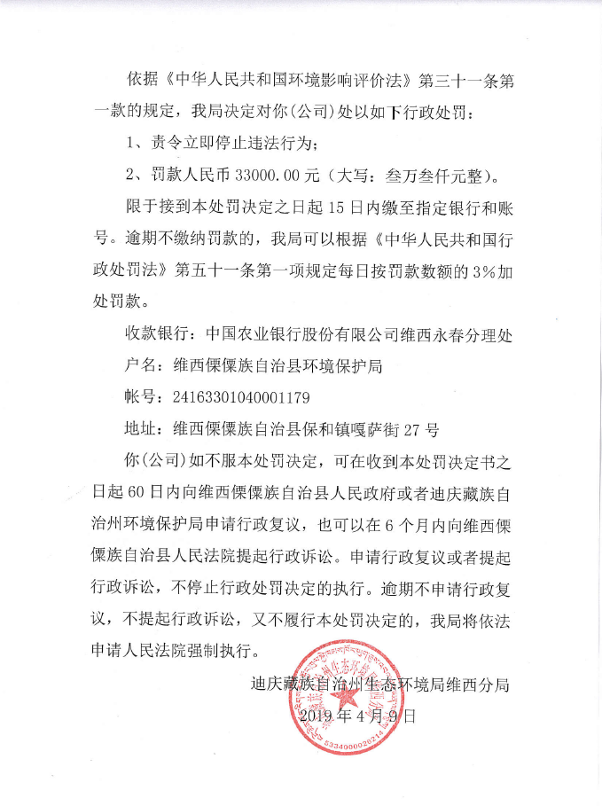 【信息公开】迪庆州生态环境局维西分局行政处罚决定书(维环罚〔2019〕02)