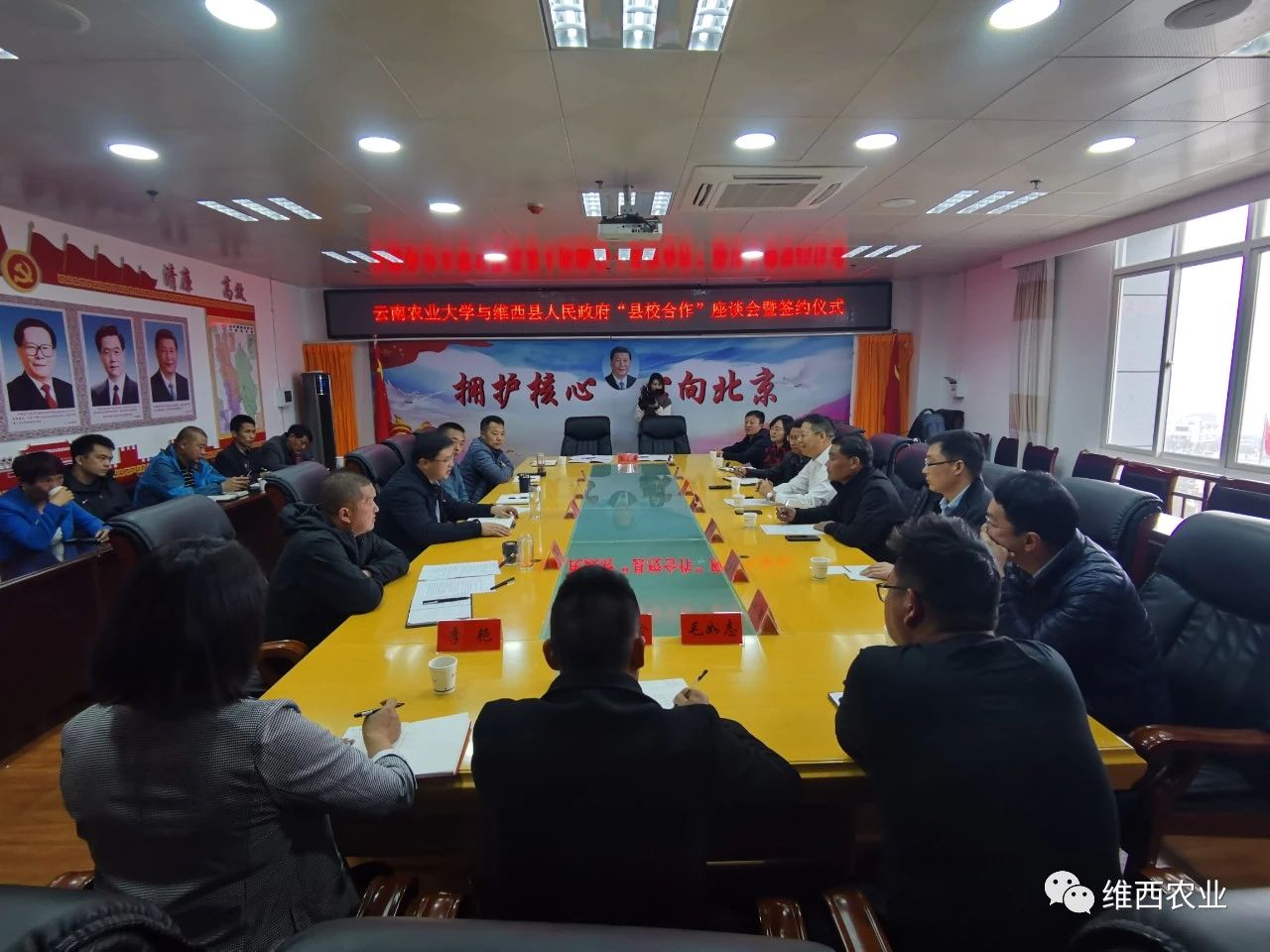 2021年3月21日,由云南农业大学副校长杨生超带队,云南农业大学“县校合作”专家组一行10人抵达维西,在行政中心6楼常务会议室与维西县人民政府签订“县校合作”框架协议并召开“县校合作”第一次座谈会。县人民政府办公室主任秦继禹主持会议,县委副书记、县长黄龙新,副县长段鸿勋,维西县“县校合作”办公室人员及维西县企业代表参加座谈会。