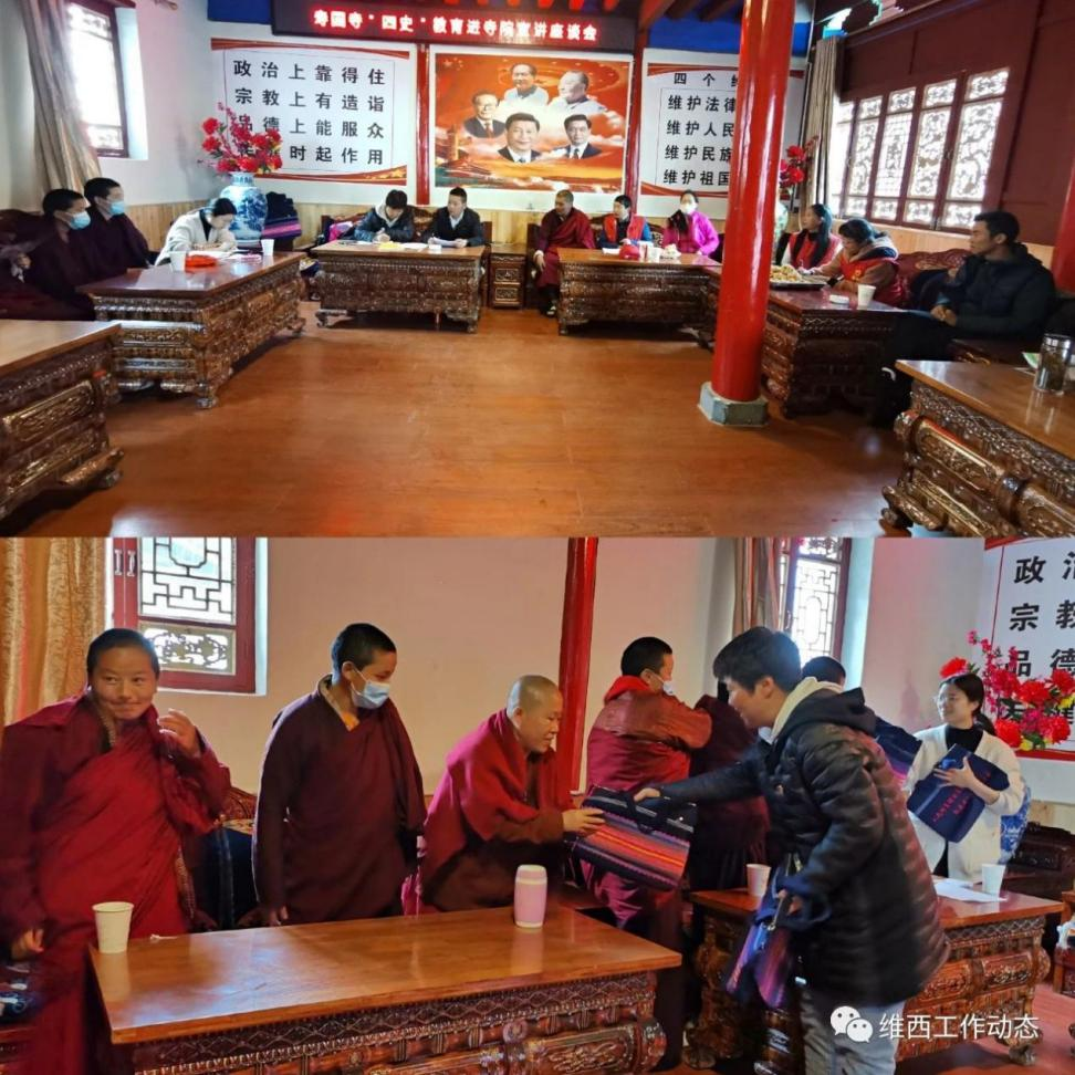 开展党史教育。为认真贯彻落实维西县党史学习教育动员大会精神,营造党史学习教育浓厚氛围,县委办邀请县委党校教师余莉珍同志,为县委办党支部、县委统战部党支部、岔枝村党总支、康普寺庙管理局党员及寿国寺僧尼开展“四史”教育。余莉珍老师从学习中共党史的目的和意义、中国共产党的发展脉络、百年光辉历程带来的启示三个方面,带大家回顾了中国革命的历史,使参学的党员干部、僧尼更加清晰地了解这一百年来,中国共产党是如何发展、如何壮大、如何赢得民心、如何践行为民服务宗旨的。授课结束后县委办服务基层小分队组织到会党员观看了开国大典的影像资料。通过开展党史教育,认真贯彻落实了我县党史学习教育动员大会提出的党史知识进机关、社区(村)、宗教活动场所等活动要求,进一步推动党史学习教育深入群众、深入基层、深入人心。