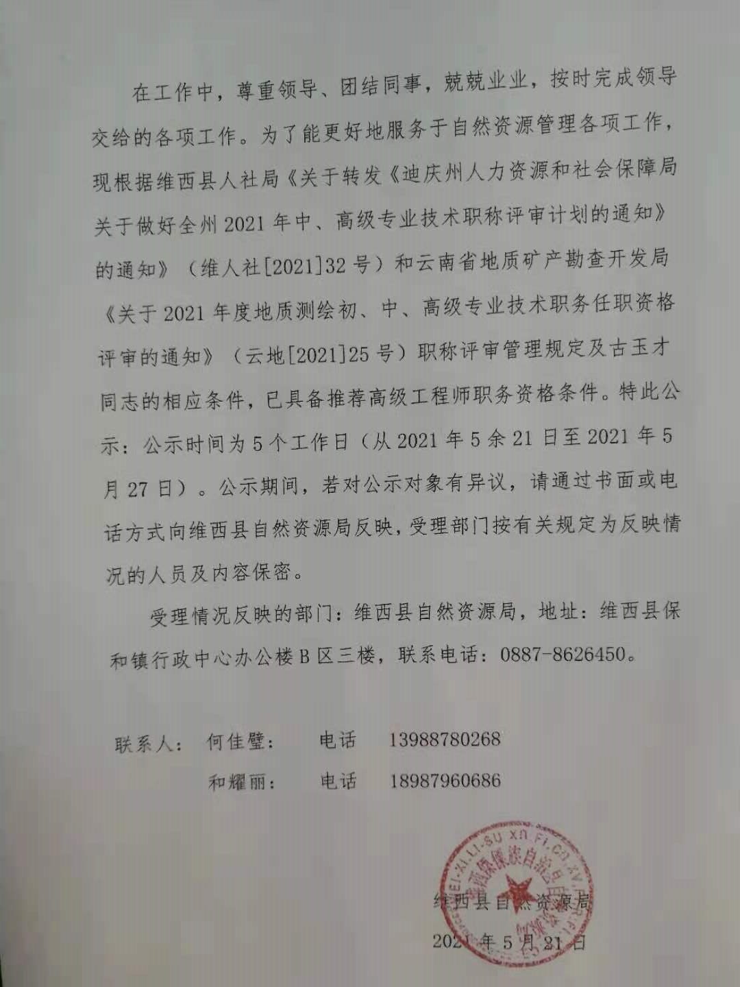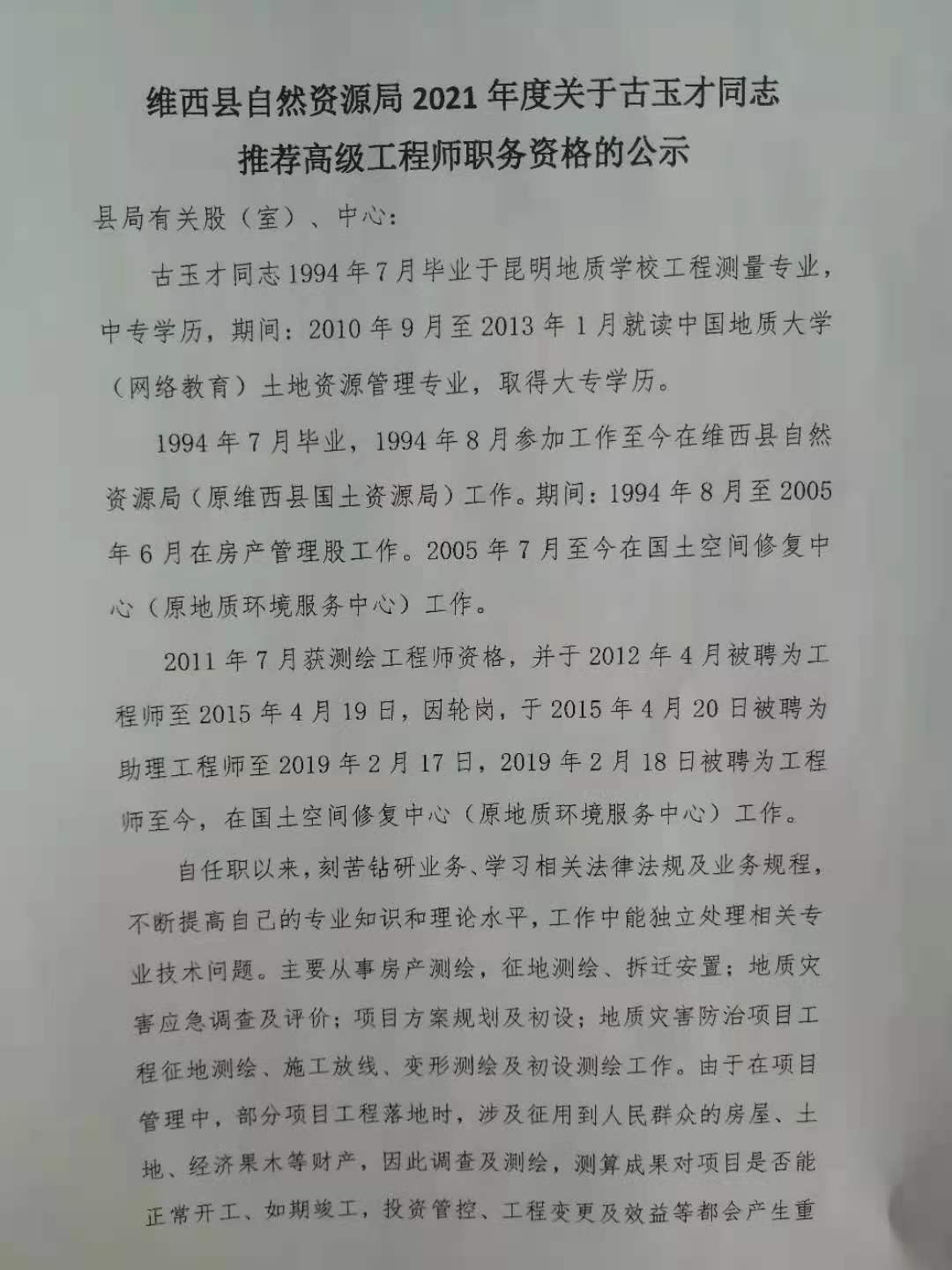 【县自然资源和规划局】维西县自然资源局2021年度关于古玉才同志推荐高级工程师职务资格的公示