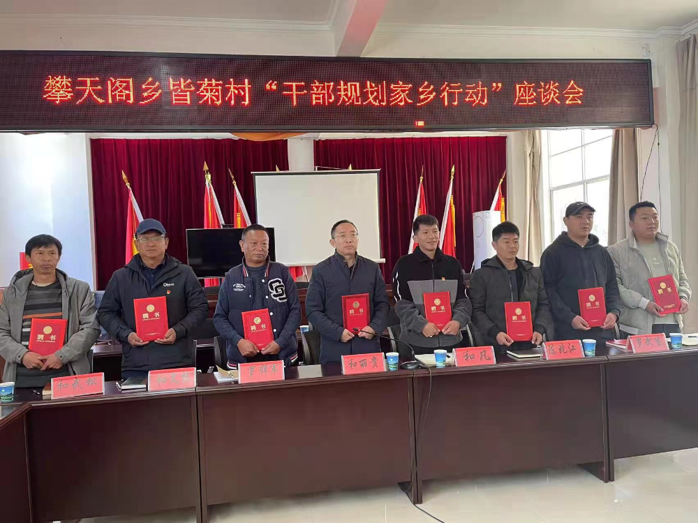 会后县委常委、组织部长蔡永鑫向攀天阁乡皆菊村“干部规划家乡行动”行政村规划编制组成员颁发聘书。