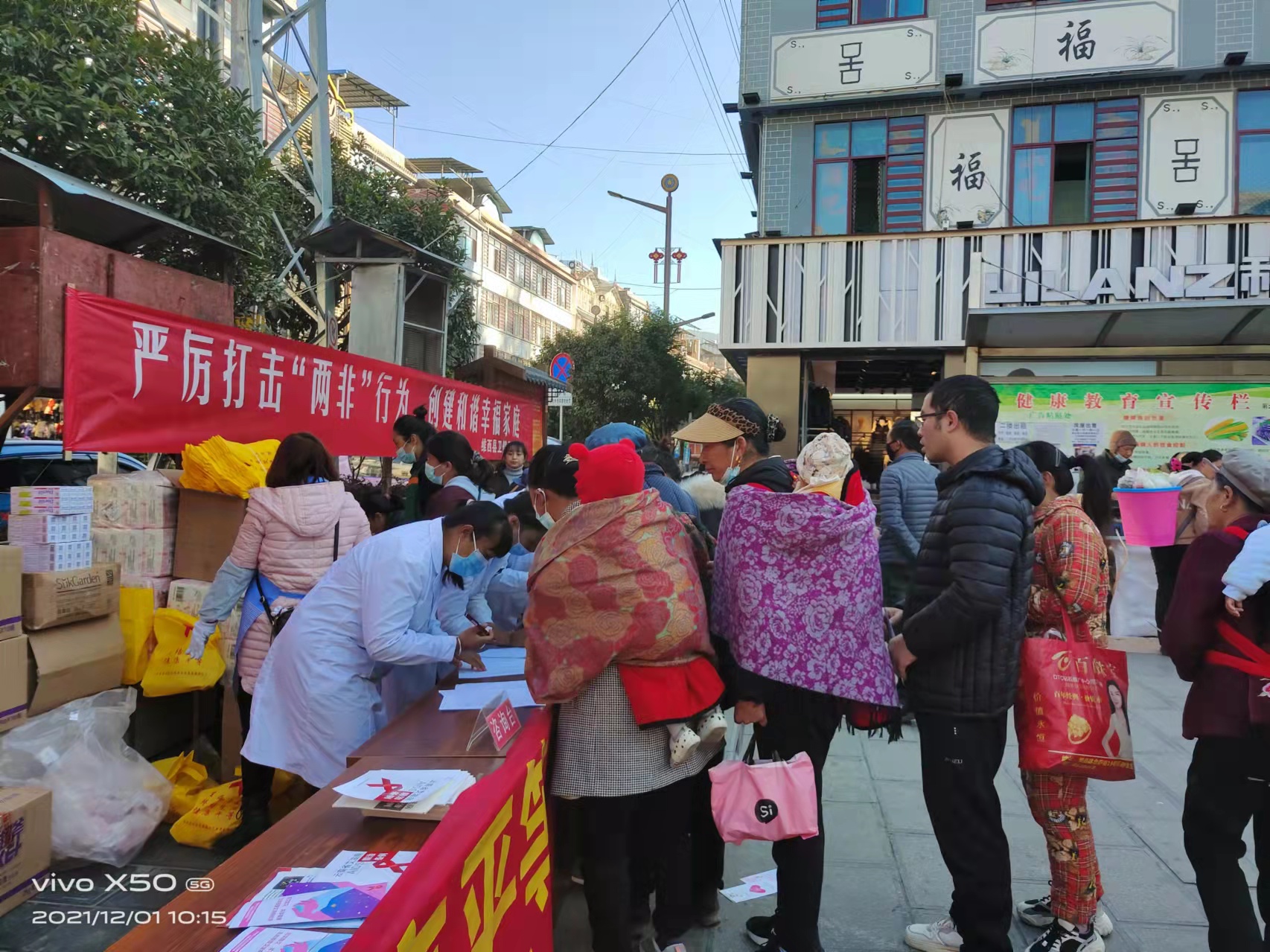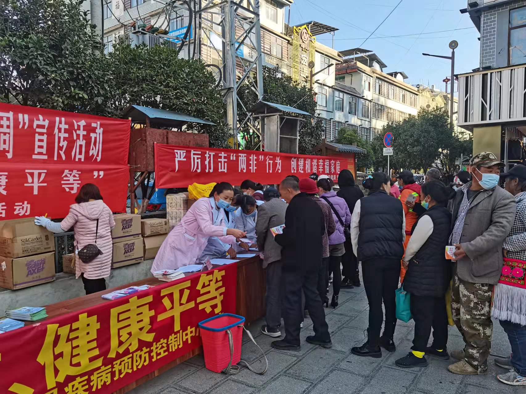 家庭是社会的细胞,而健康和谐幸福家庭是社会稳定的基础。为进一步开展“两非”性别比专项整治活动,营造良好的人口环境,消除性别歧视,拒绝非医学需要的胎儿性别鉴定和非医学需要的选择性别的人工终止妊娠,创建健康和谐幸福家庭。趁第34个“世界艾滋病日”到来之际,维西县卫健局、县市场监管局、县公安局、县人民医院、县妇幼保健计划生育服务中心、保和镇卫生院等多部门联合在维西县念萨街跳舞广场开展“严厉打击两非行为,创建和谐幸福家庭”宣传活动。