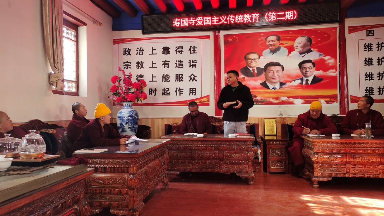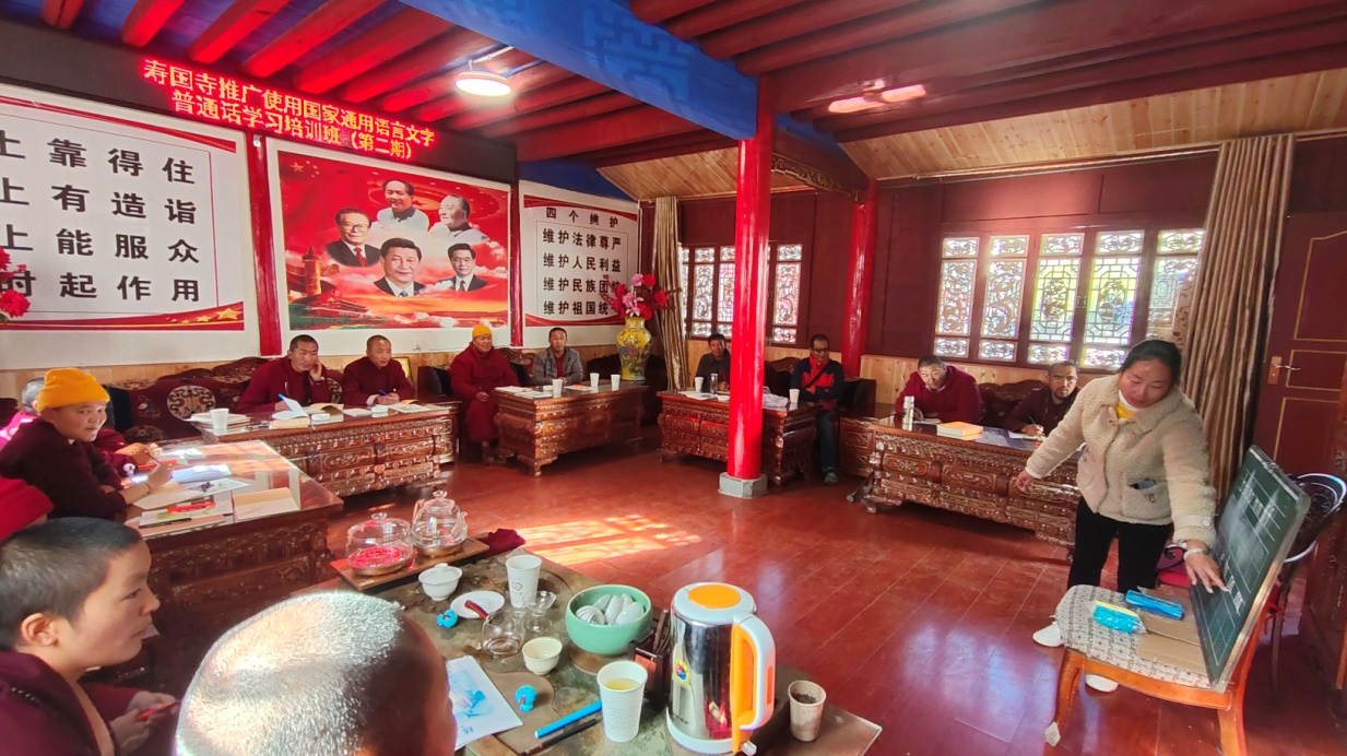 为学习贯彻习近平总书记关于民族工作的重要论述,扎实推进藏传佛教中国化进程,筑牢宗教场所”五个认同”,不断提升宗教人士使用通用语言文字和沟通交流能力。12月9日上午,寿国寺开展了第二期藏传佛教爱国主义教育及推广使用国家通用语言文字普通话培训班。