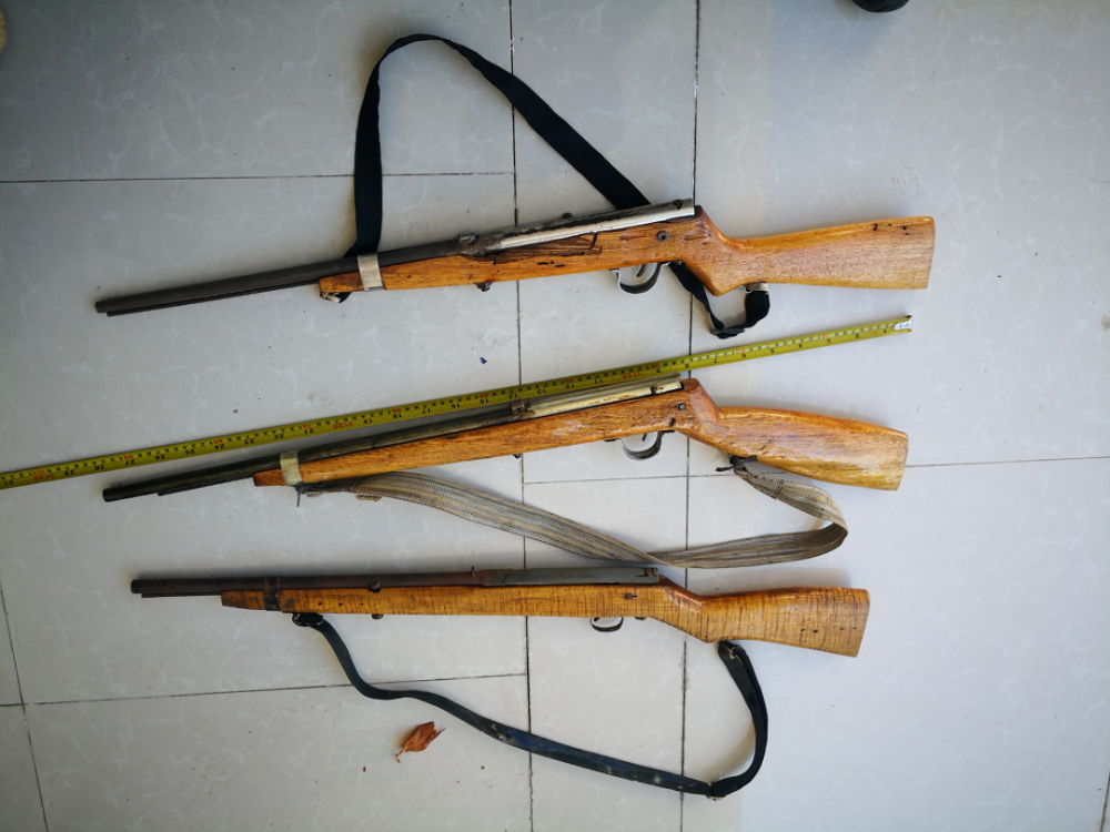 民警在工作中发现,辖区群众余某军、余某华、余某全三人有私藏枪支的嫌疑,随即展开调查,在三名嫌疑人家中缴获自制枪支3支,射钉弹353发、疑似黑火药1小瓶。经讯问,三名犯罪嫌疑人对自己非法持有枪支的犯罪事实供认不讳。 目前,案件正在进一步审理中。