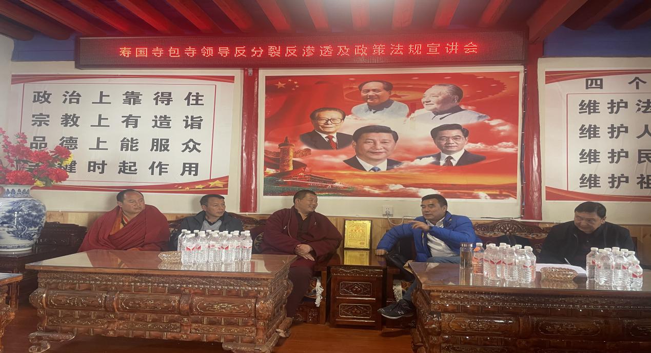 格桑朗杰一行人坚持问题导向,直奔主题,通过与县民宗局局长余海军、寺庙管理局局长李俊、寿国寺民管会副主任斯郎邓珠以及部分僧尼实地查看、座谈交流、听取汇报等方式,深入了解了寿国寺的历史渊源、发展历程、寺院现状和僧人管理、爱国爱教等方面的相关情况以及存在的困难,亲切看望慰问了寺院民管会和寺院僧尼。