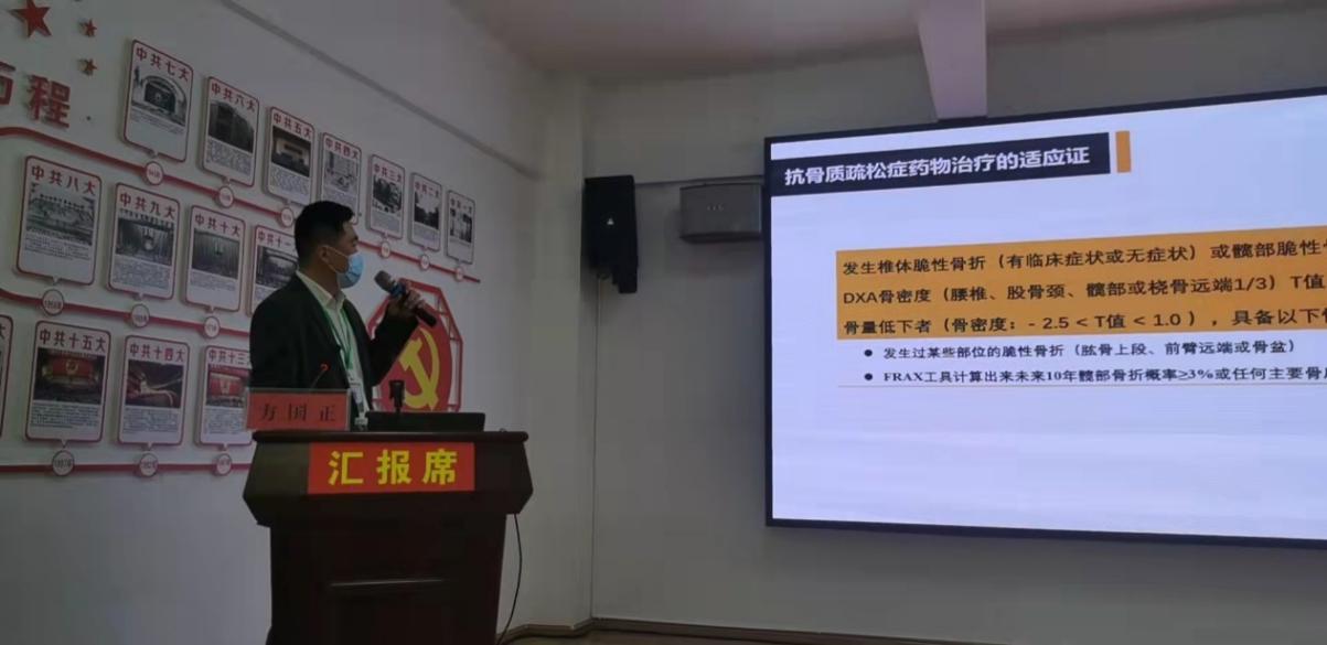 县医院创伤外科就诊的外伤病人,病情多较严重,方国正医师帮扶的创伤外科承担的手术难度大、任务重。帮扶专家方国正医师与县医院创伤外科团队们不知疲倦、认真仔细地完成每一台手术。其中老年骨折多与骨质疏松有关,方国正医师为广大医务人员准备了“骨质疏松症”一课。从骨质疏松的概念、临床表现、风险评估、治疗措施以及维护骨骼健康的措施等多方面诠释了骨质疏松的诊疗规范。