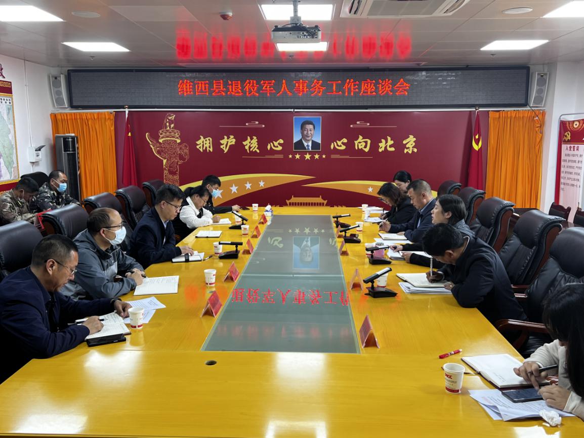 10月11日上午,在行政中心六楼常务会议室召开了维西县退役军人事务工作座谈会,州人民政府副州长余桂芬、州人民政府副秘书长林维平、州退役军人事务局局长杨立中、州人民政府秘书三科科长此里白追、县人民政府副县长李欣龙出席会议;州退役军人事务局、县委编办、县委政法委、县政府办、县公安局、县财政局、县退役军人事务局、县信访局相关负责人及五名退役士兵参加了座谈会。