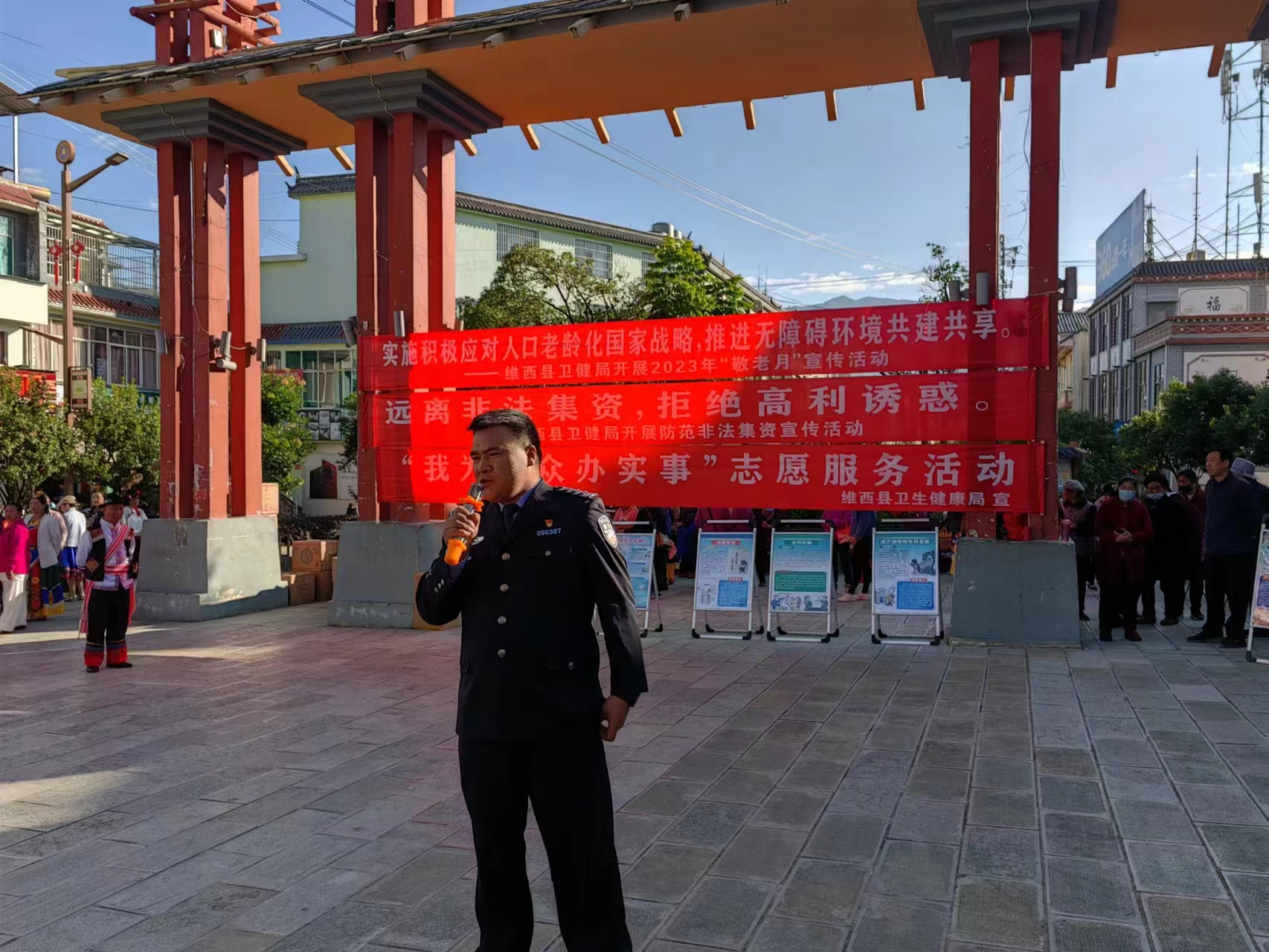 为弘扬中华民族敬老、爱老、助老的传统美德,丰富广大老年人的精神文化生活,引导全社会都来关心老年人,营造良好的社会氛围。根据《云南省老龄工作委员会转发开展 2023 年全国“敬老月”活动的通知》(云老龄委发〔2023〕1 号)精神,10月20日维西县卫生健康局联合县妇计中心、保和镇卫生院、保和镇部分老龄协会,在念萨街牌坊处开展全国第14个“敬老月”宣传及义诊活动。此次活动以“实施积极应对人口老龄化国家战略,推进无障碍环境共建共享”为主题,并将积极开展防范养老领域非法集资宣传教育、持续推进“智慧助老”行动贯穿到活动始终。
