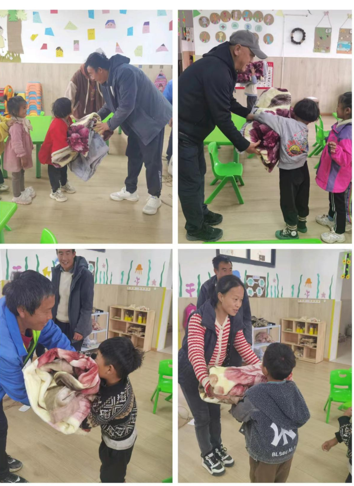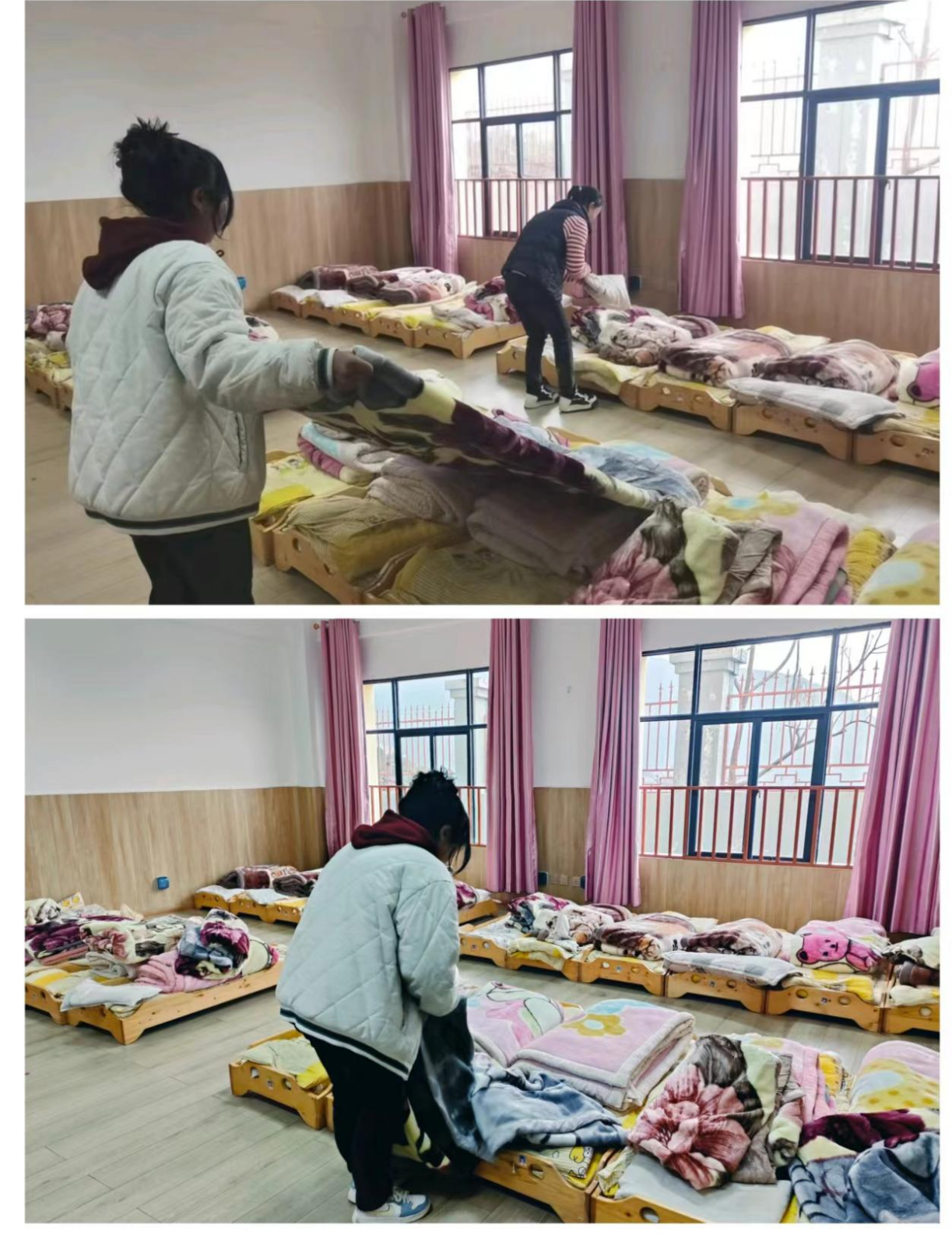 活动中,村委会主任和德元详细了解幼儿的生活及身体状况,告诉老师遇到困难可以及时和村委会联系,村委会将尽可能提供帮助。活动最后,村妇联主席和丽萍与老师一起帮助小朋友整理床铺,希望这床小毛毯的加入,他们的午觉睡得更香、更甜。