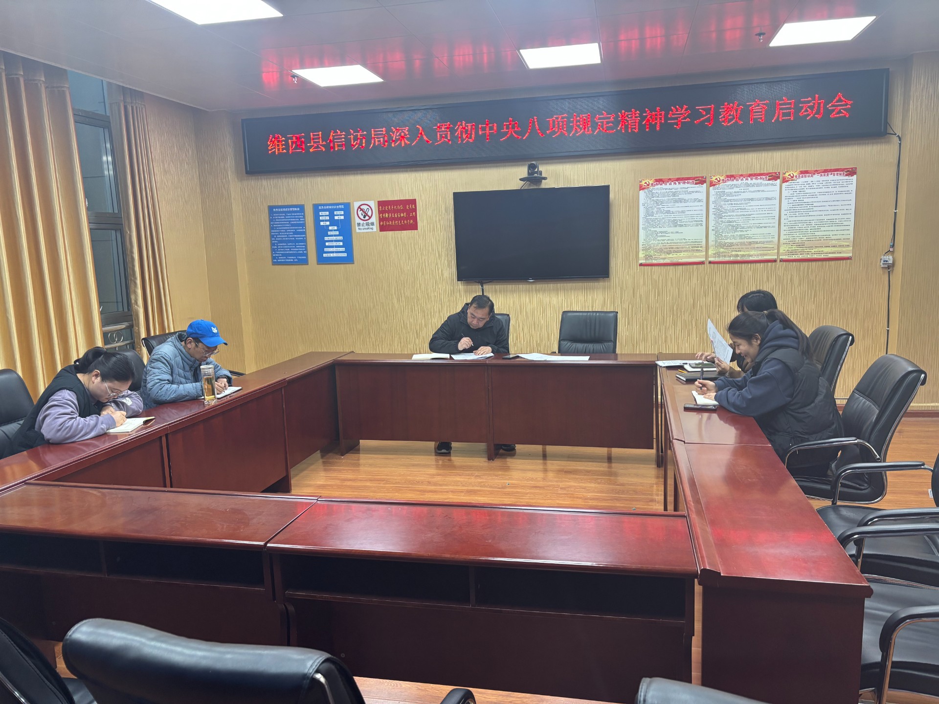 会议传达学习了中央、省委、州委、县委关于深入贯彻中央八项规定精神学习教育相关会议精神。会议并指出,开展学习教育是进一步加强党的作风建设、推动全面从严治党向纵深发展的必然要求,是巩固深化主题教育和党纪学习教育成果的重要举措,全体信访干部要统一思想,提高站位,深刻认识开展学习教育活动重要性的认识,聚焦重点工作,结合单位实际,把中央八项规定精神贯彻落实到信访工作全过程,持续构建风清气正的机关政治生态,以优良作风保障信访工作法治化改革各项举措落地落实。