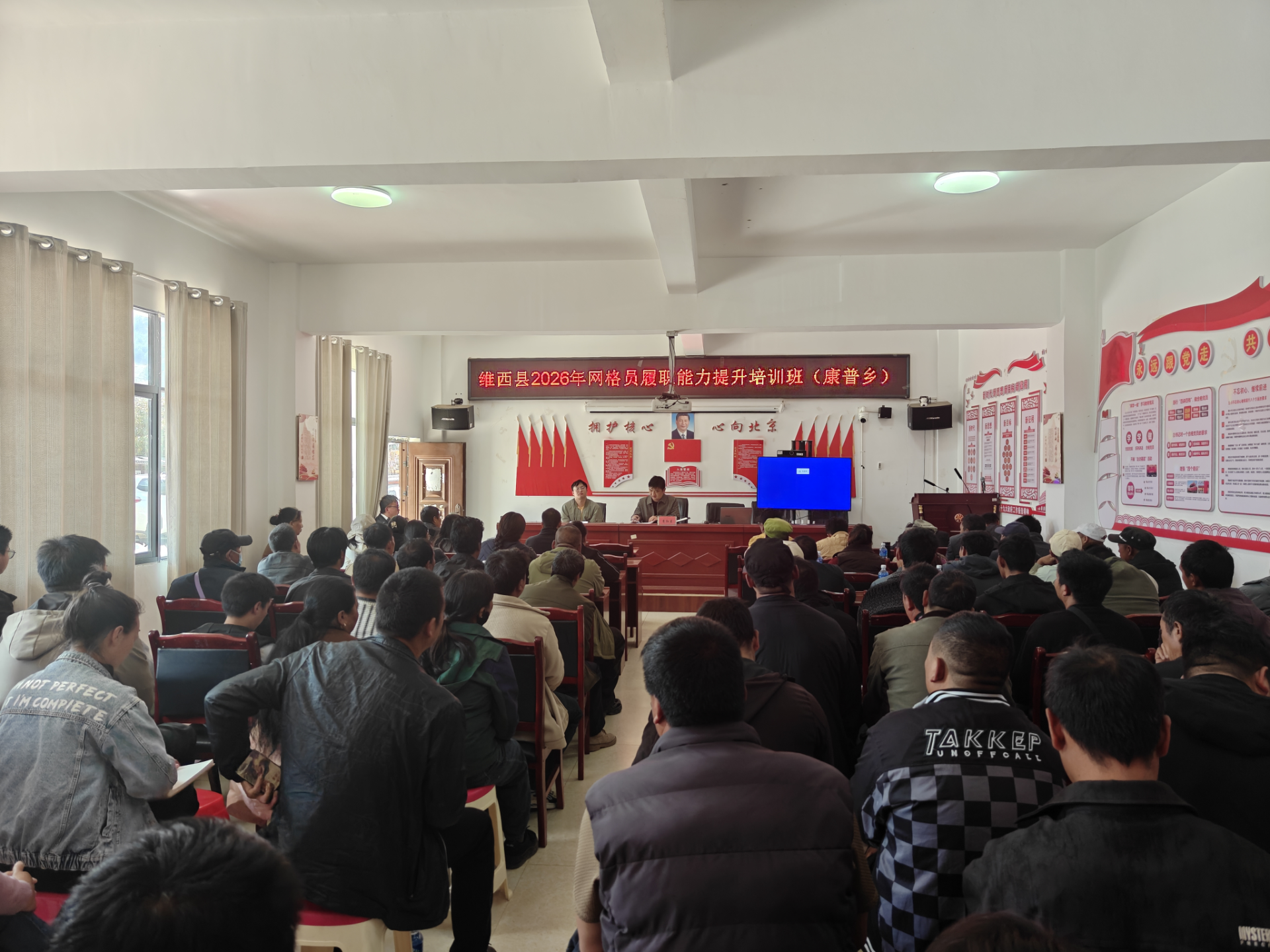 为深入贯彻落实新时代“枫桥经验”本土化实践要求,建强基层治理“神经末梢”,进一步提升网格员综合履职能力素质,夯实平安建设与民生服务根基,在县委政法委、县委统战部等上级部门的领导支持下,在3月11日成功举办2026年度网格员履职能力提升专题培训班,康普乡维稳副书记、综治中心全体工作人员、派出所、司法所、各村总支书记、主任、网格员全员共100余人参训。