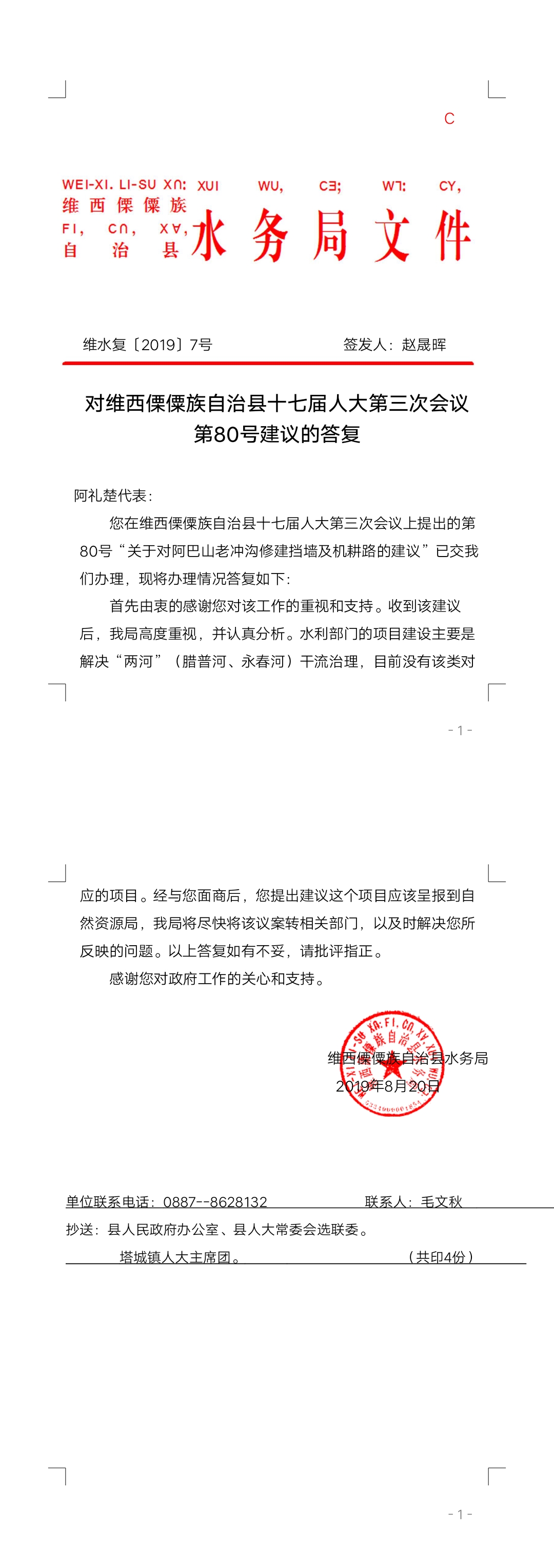 【政府信息】对维西傈僳族自治县十七届人大第三次会议第80号建议的答复