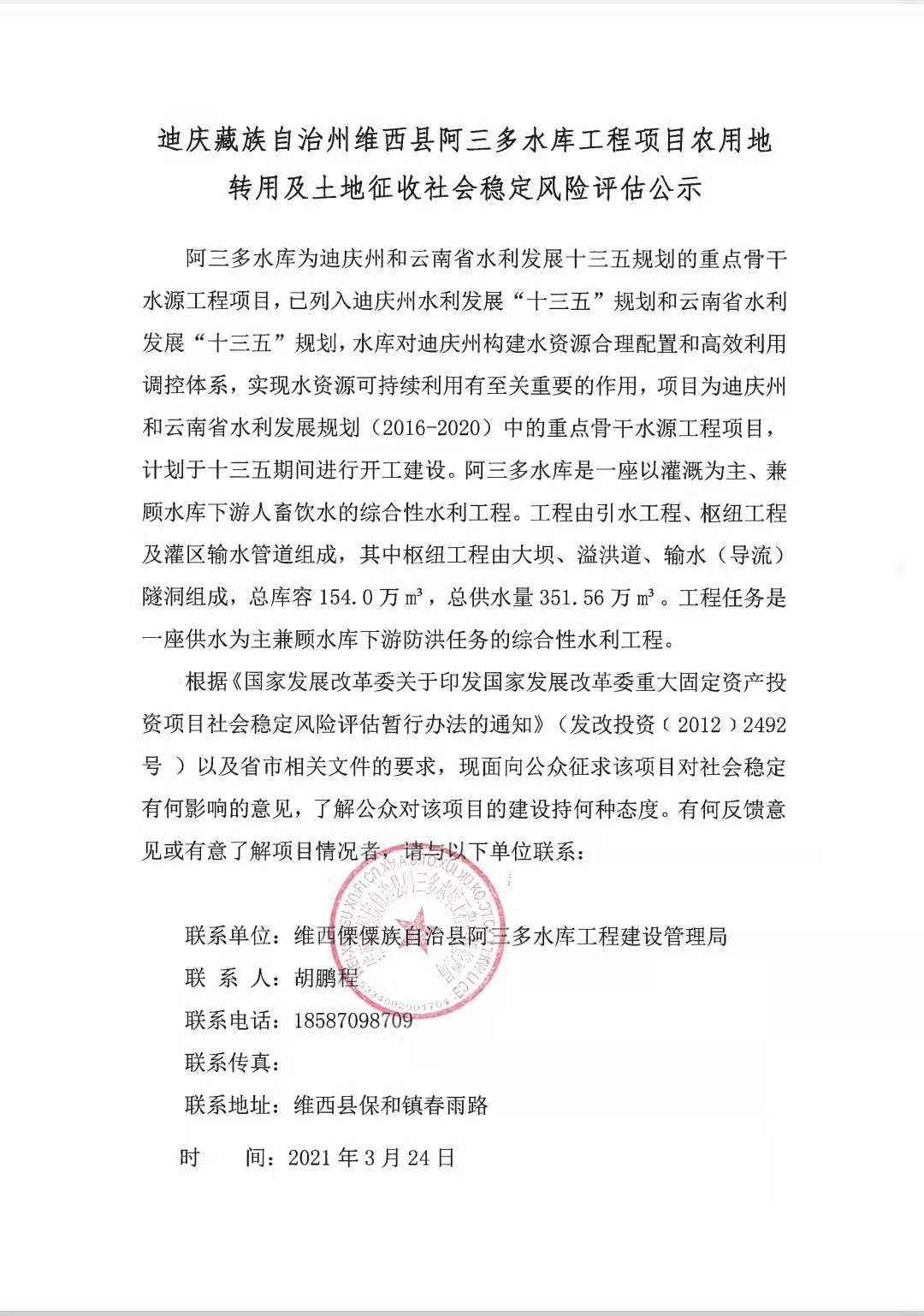 【信息公开】迪庆藏族自治州阿三多水库工程项目农用地转用及土地征收社会稳定风险评估公示