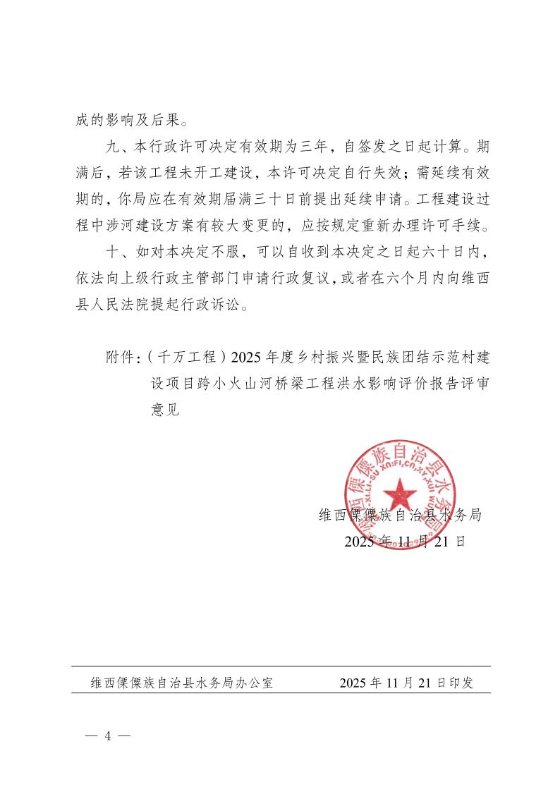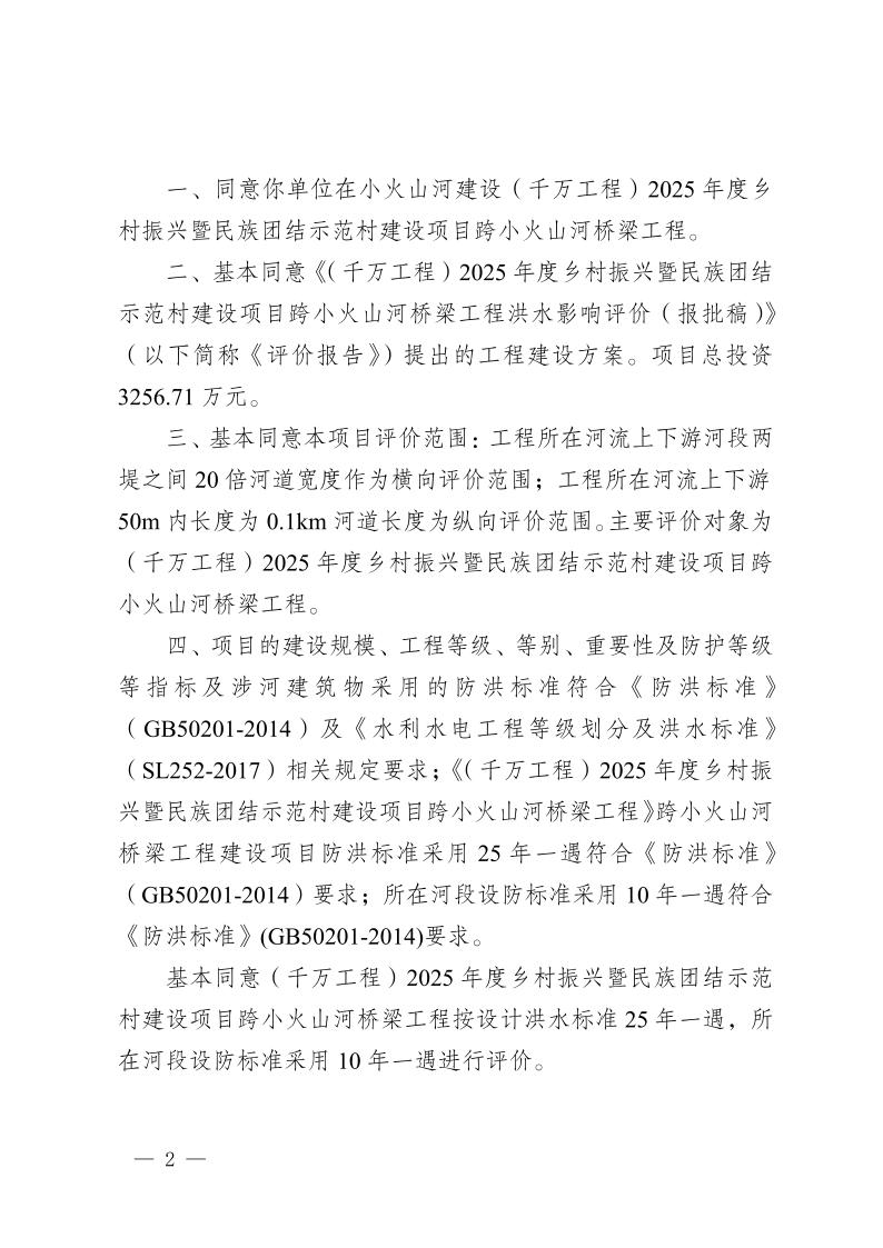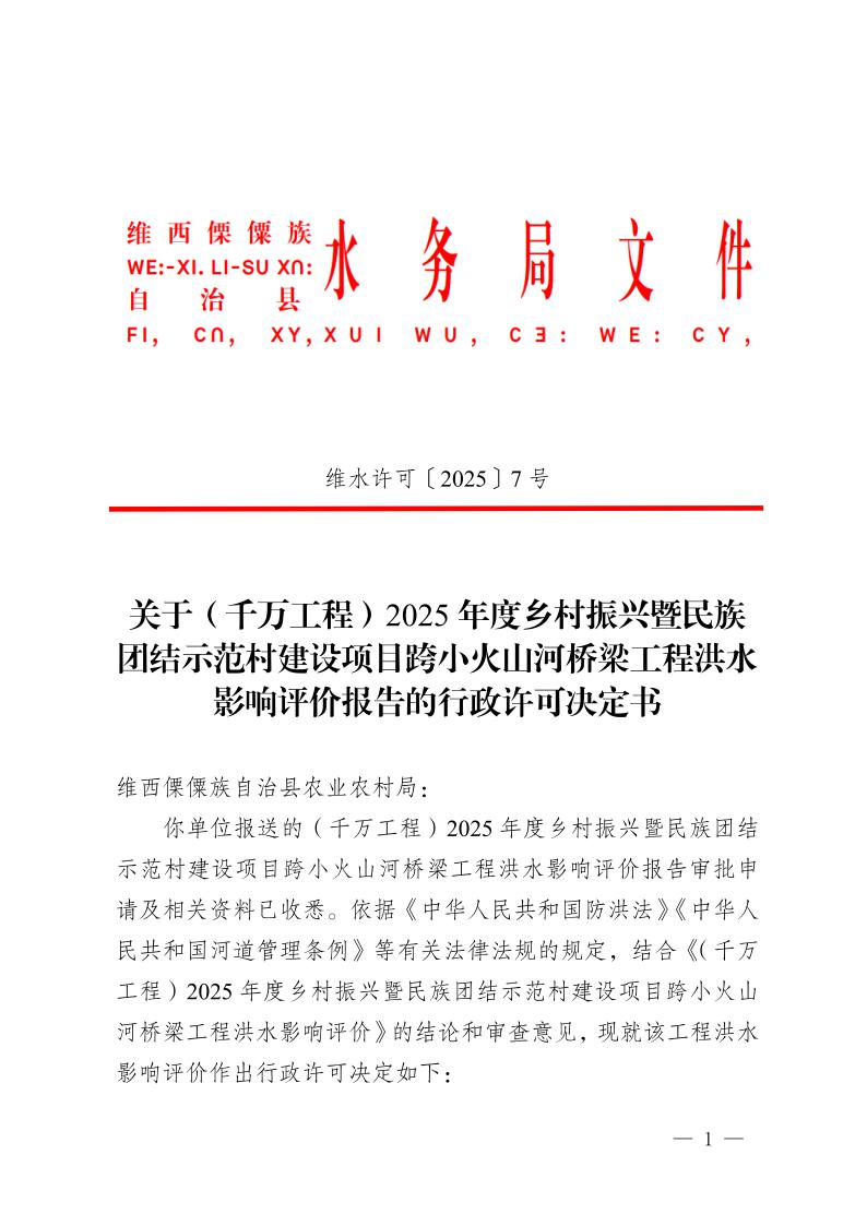 关于(千万工程)2025年度乡村振兴暨民族团结示范村建设项目跨小火山河桥梁工程洪水影响评价报告的行政许可决定书