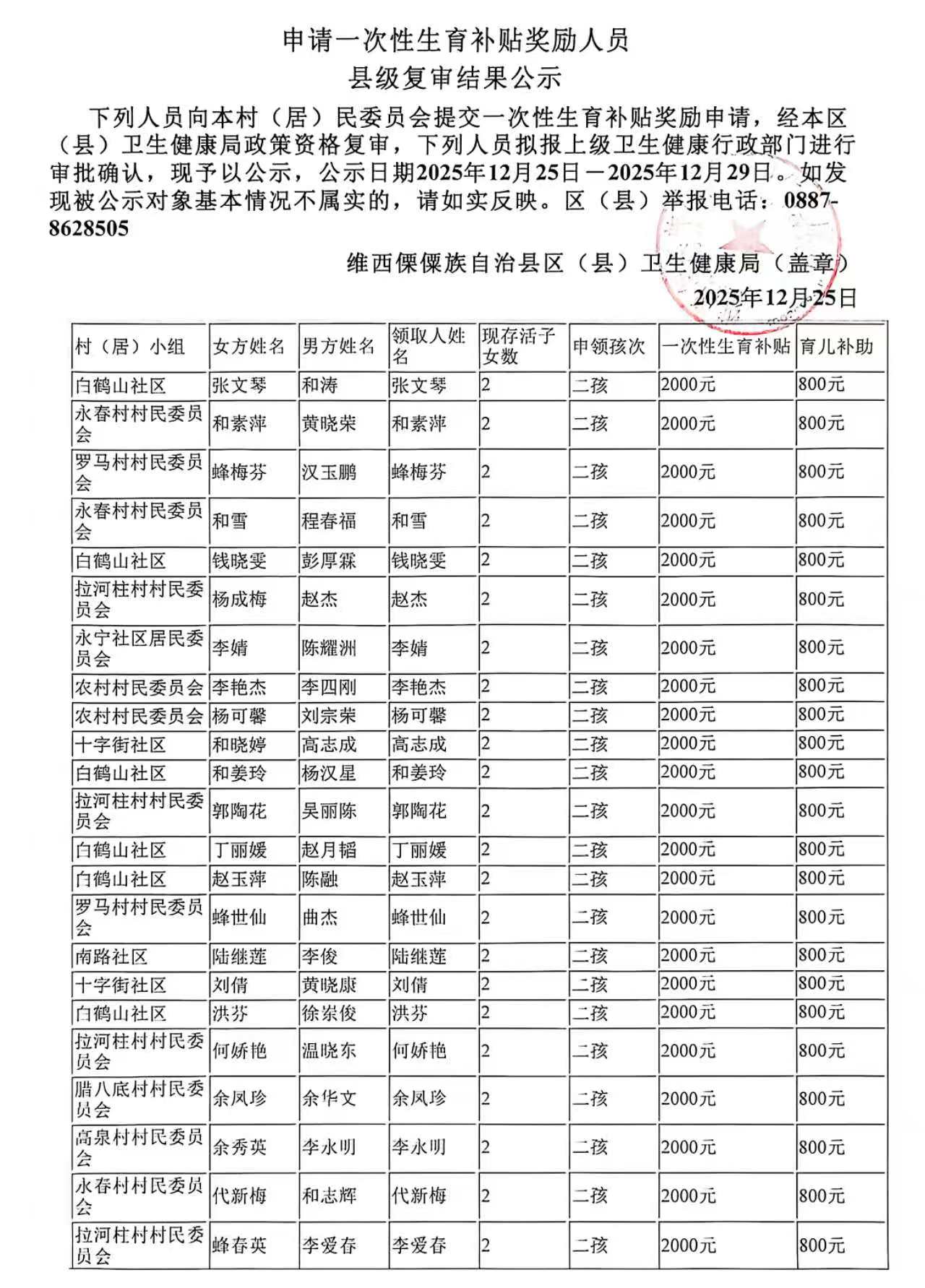 申请一次性生育补贴奖励人员县级复审结果公示20251225