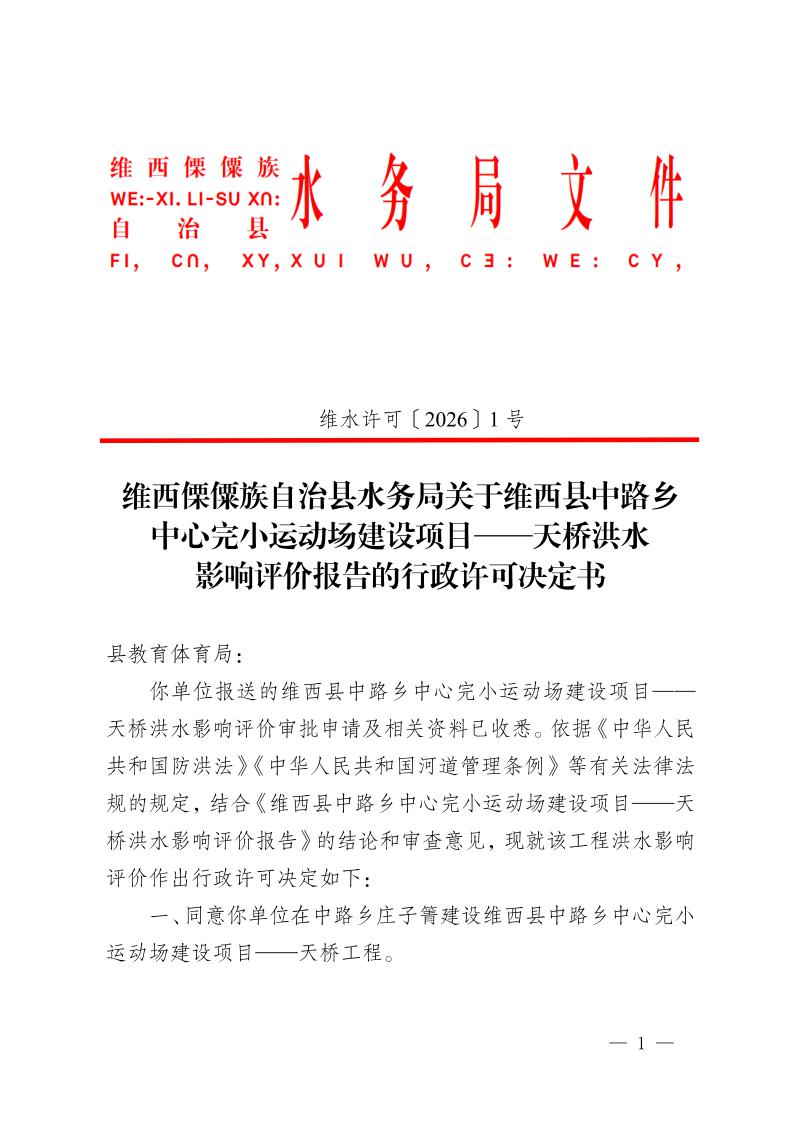 维水许可〔2026〕1号 维西傈僳族自治县水务局关于维西县中路乡中心完小运动场建设项目——天桥洪水影响评价报告的行政许可决定书(1).ofd