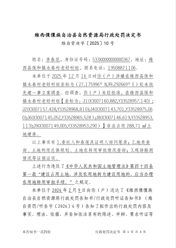 对李春花户行政处罚决定书