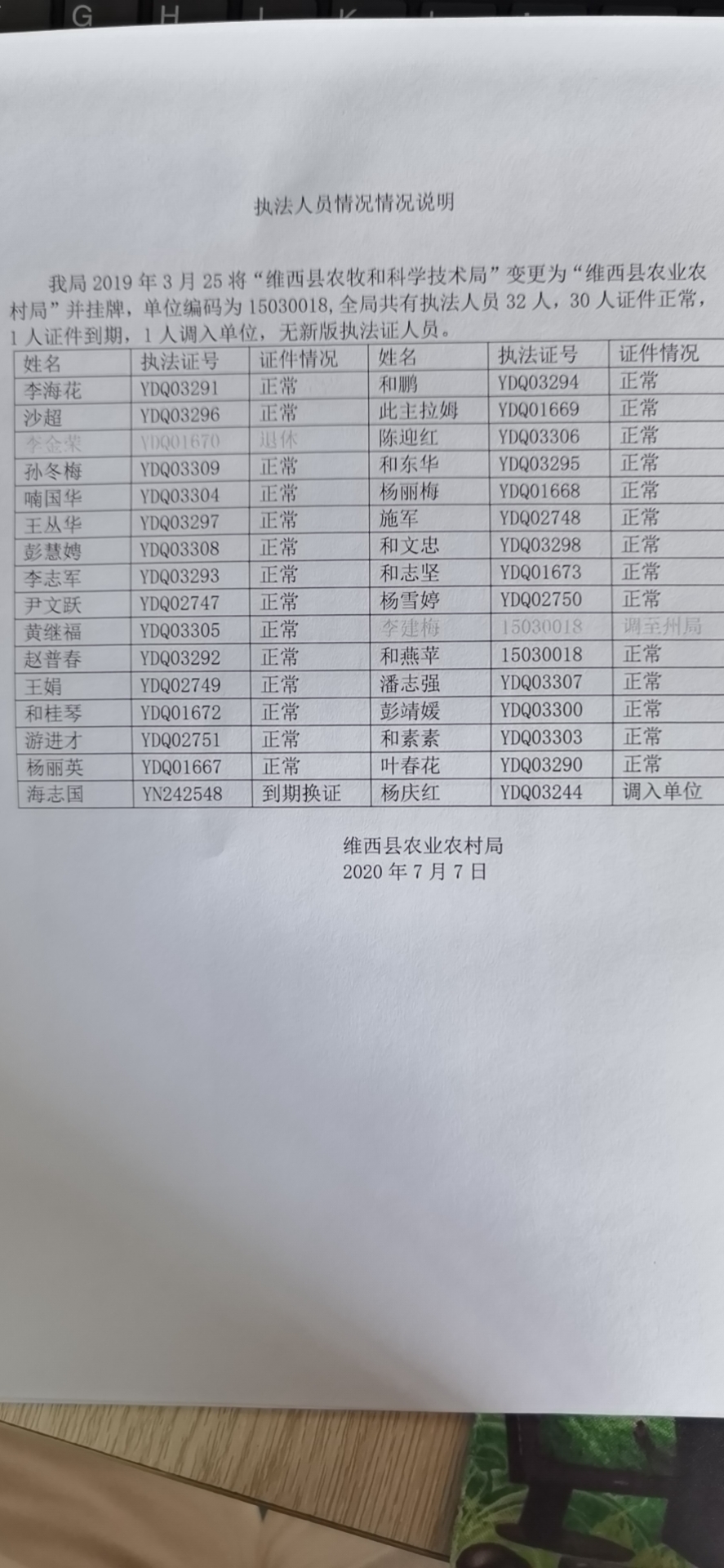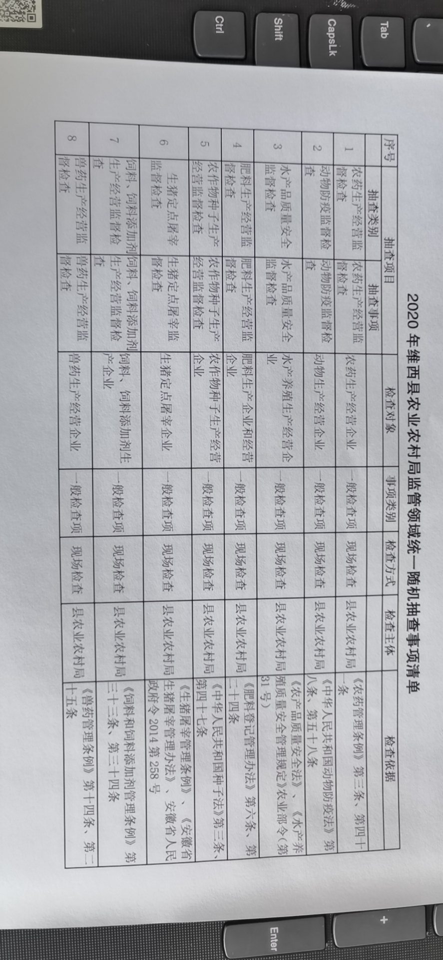 八、执法职责:依照涉农法律、法规、规章的规定, 负责对农业生产资料及农业投入品中的种子、苗木、农药、农膜、肥料、兽药、种畜禽、饲料及其添加剂等经营监管和安全使用管理;负责对植物危险性、病虫疫情进行封销控制和管理,实施隔离试种、产地检疫,发放产地检疫和调运检疫证书,开展法规授权的植物检疫专业执法;承担全县兽医兽药、种畜禽、饲料和饲料添加剂、生猪屠宰、种子、化肥、农药、动物防疫、植物检疫、渔政、农机、水生野生动植物保护、农产品质量等的行政处罚、行政检查、行政强制监督工作。