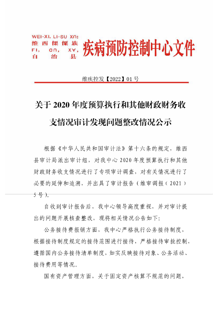 关于 2020 年度预算执行和其他财政财务收支情况审计发现问题整改情况公示