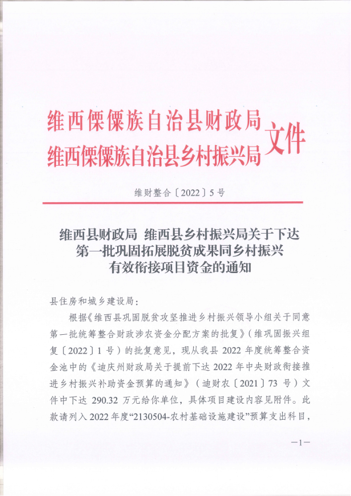 维西县财政局 维西县乡村振兴局关于下达第一批巩固拓展脱贫攻坚成果同乡村振兴有效衔接项目资金的通知