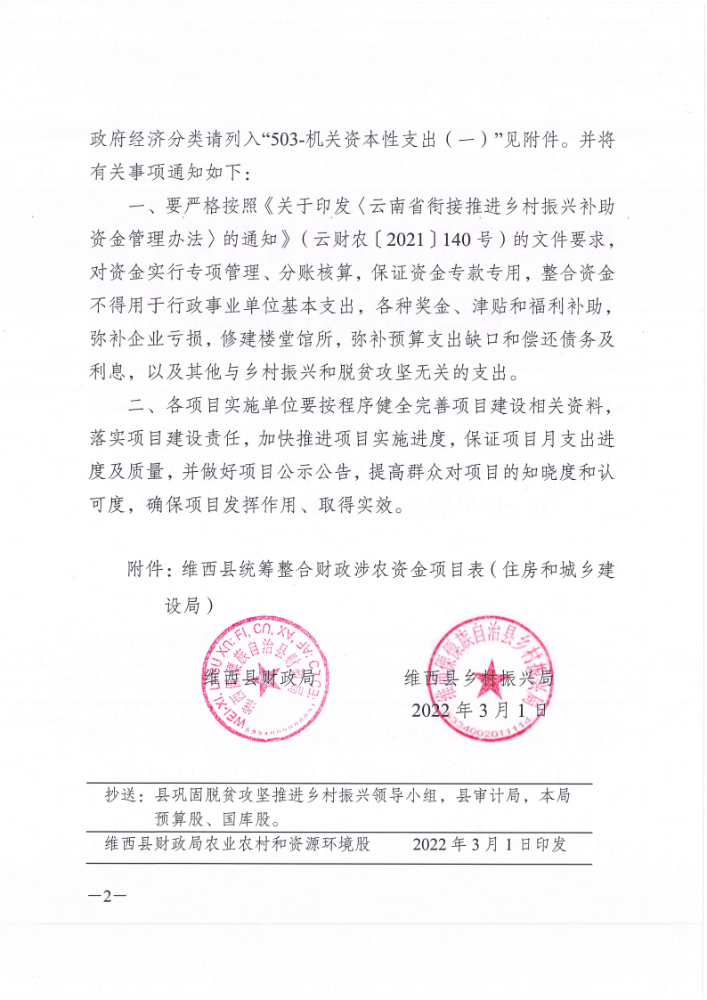 维西县财政局 维西县乡村振兴局关于下达第二批巩固拓展脱贫攻坚成果同乡村振兴有效衔接项目资金的通知