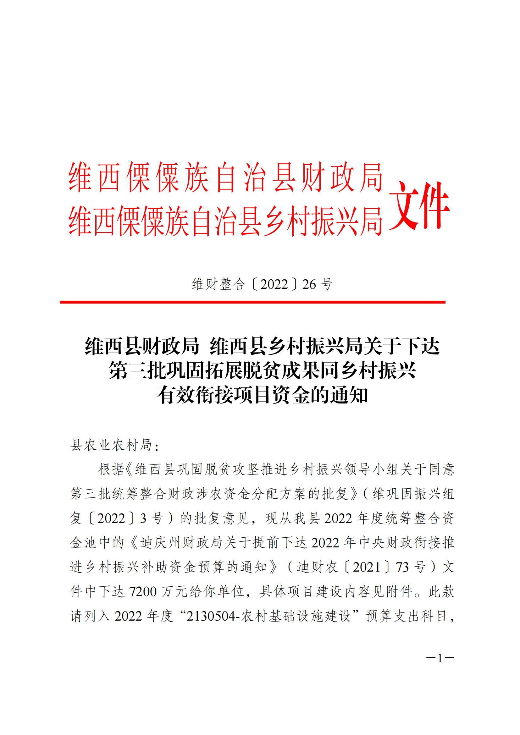 维西县财政局 维西县乡村振兴局关于下达第三批巩固拓展脱贫攻坚成果同乡村振兴有效衔接项目资金的通知