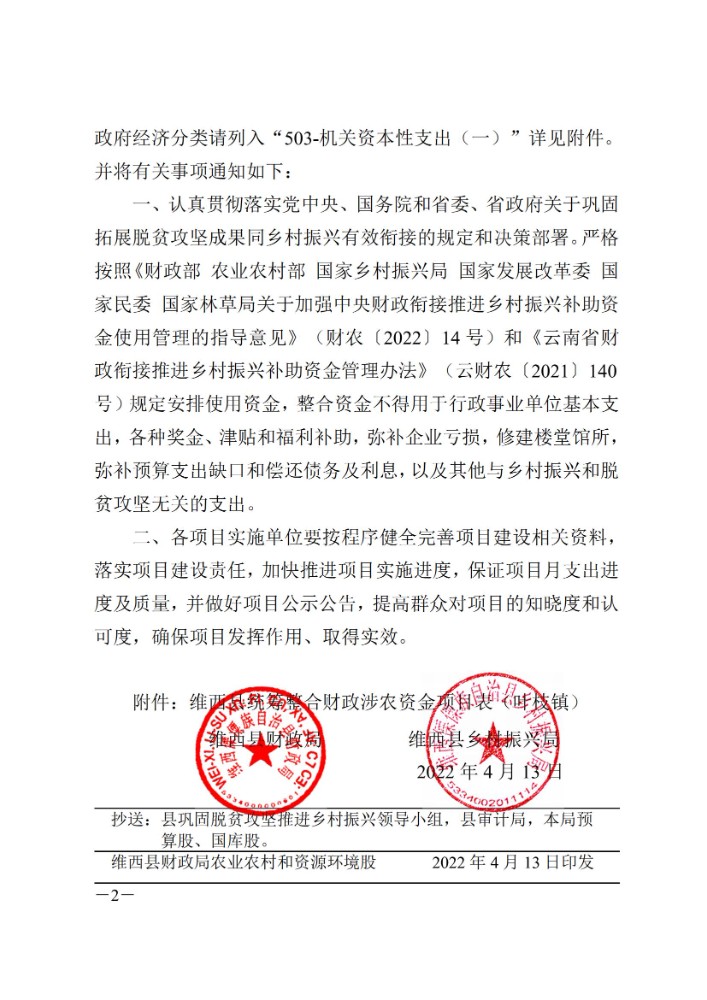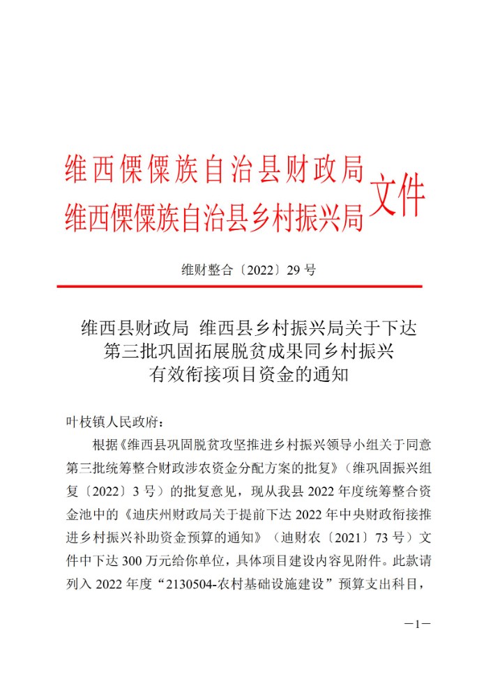 维西县财政局 维西县乡村振兴局关于下达第三批巩固拓展脱贫攻坚成果同乡村振兴有效衔接项目资金的通知