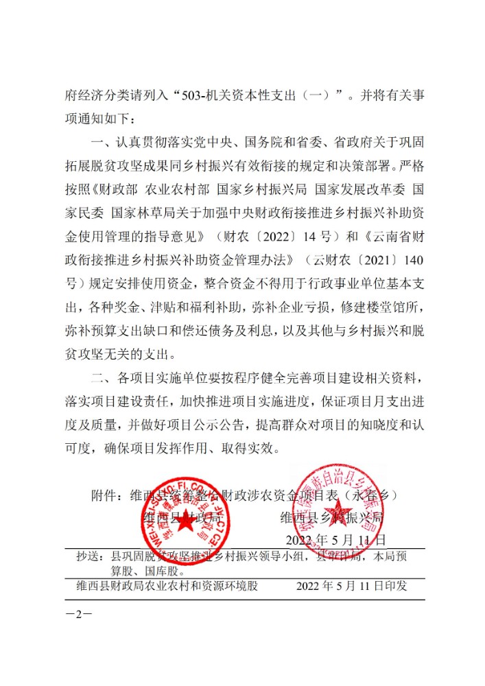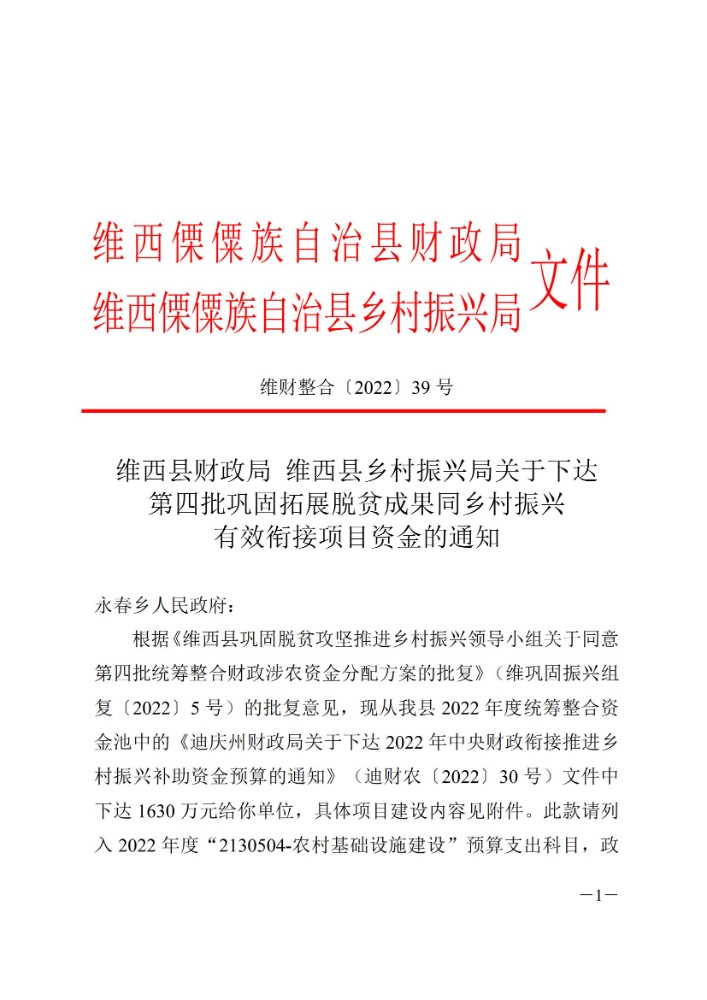 维西县财政局 维西县乡村振兴局关于下达第四批巩固拓展脱贫攻坚成果同乡村振兴有效衔接项目资金的通知