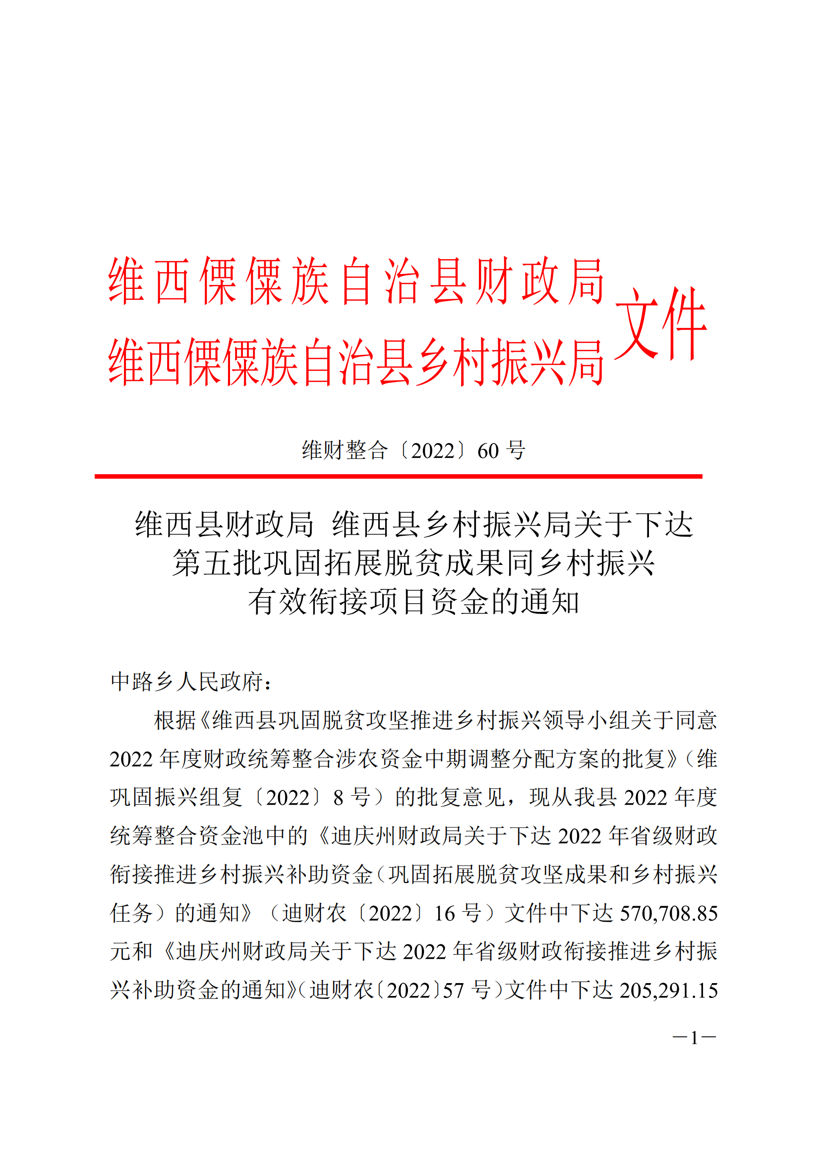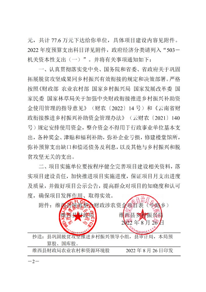维西县财政局 维西县乡村振兴局关于下达第五批巩固拓展脱贫攻坚成果同乡村振兴有效衔接项目资金的通知